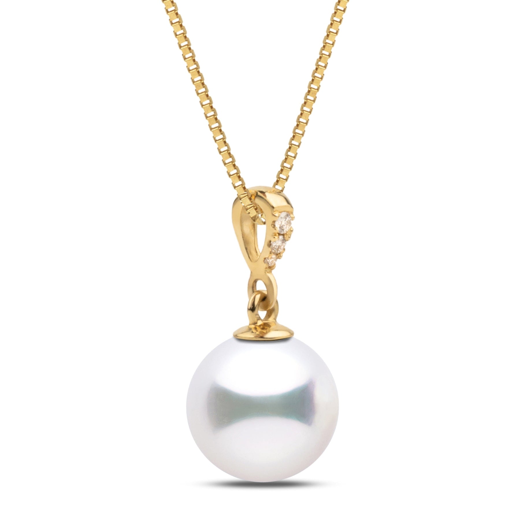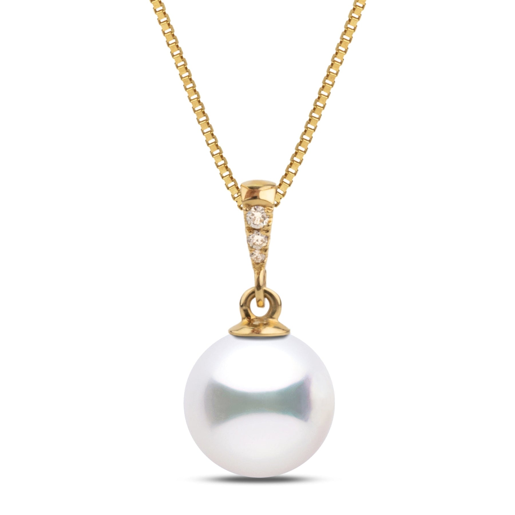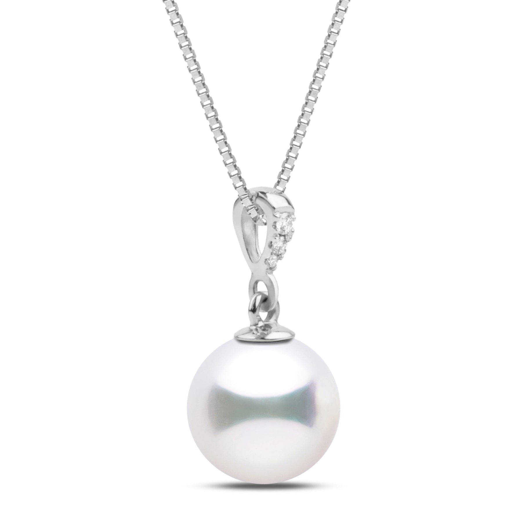 The simple design of the Diamond Grace Collection pendant will hang gracefully from your neck, radiating the beauty of the 8.5-9.0 mm AAA Akoya pearl accented by three graduated VS1-G diamonds, 0.03 cttw.