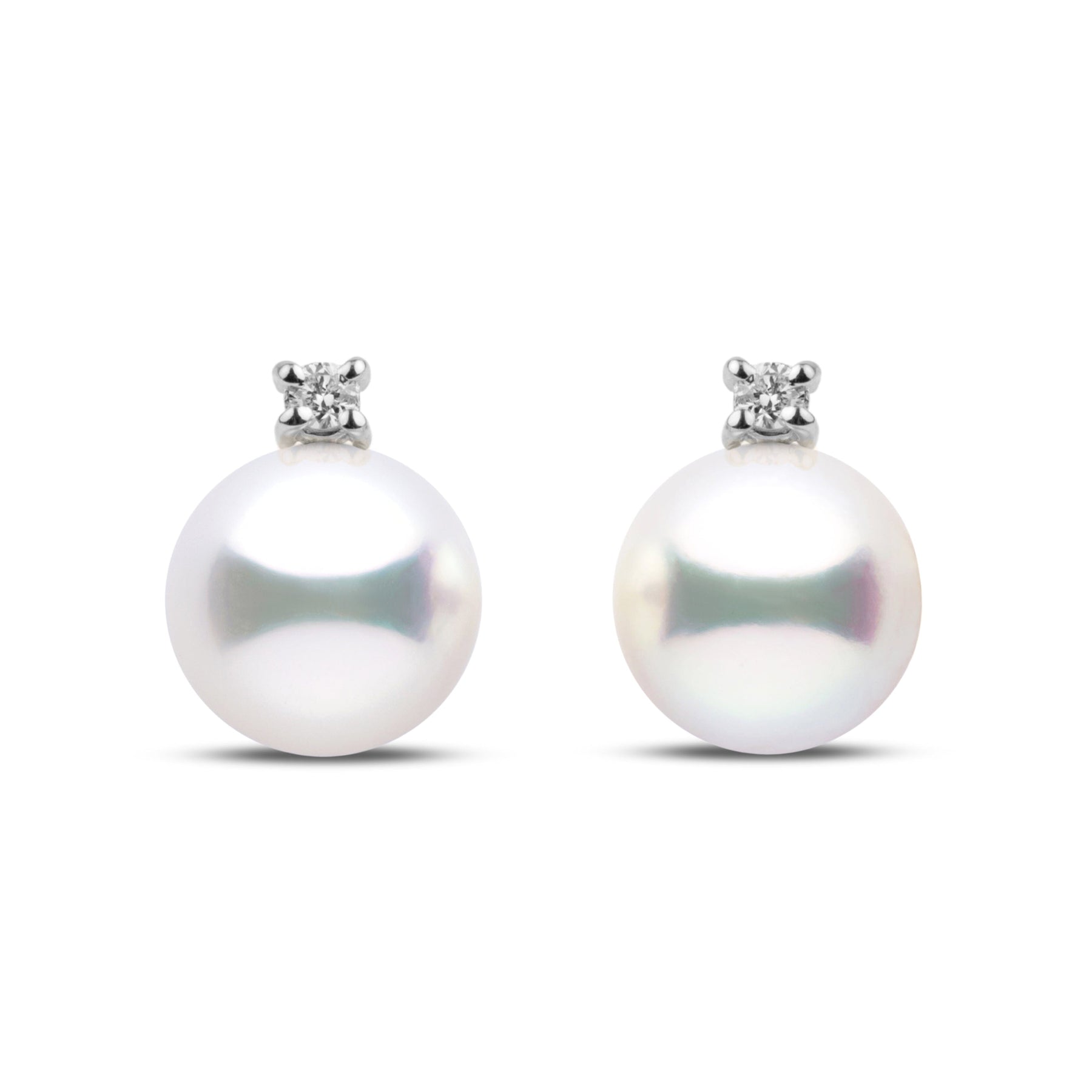 These exquisite earrings feature two perfectly round, white Akoya pearls mounted on 14-karat gold posts with two sparkling, brilliant round-cut, prong-set diamonds. This elegant set of AAA quality, 8.5-9.0 mm pearls has brilliant luster, a mirror-like reflection, and a perfectly smooth surface.