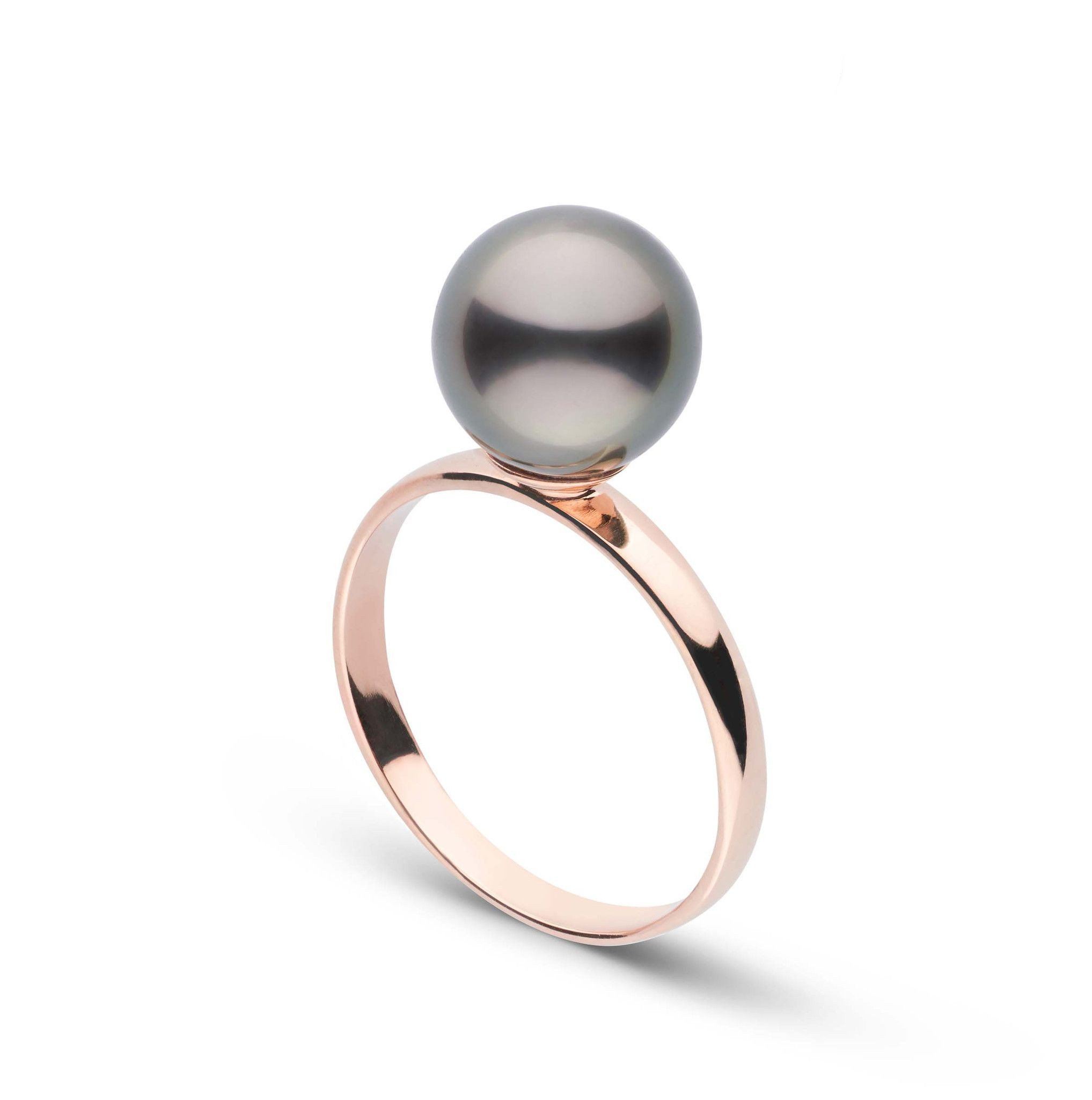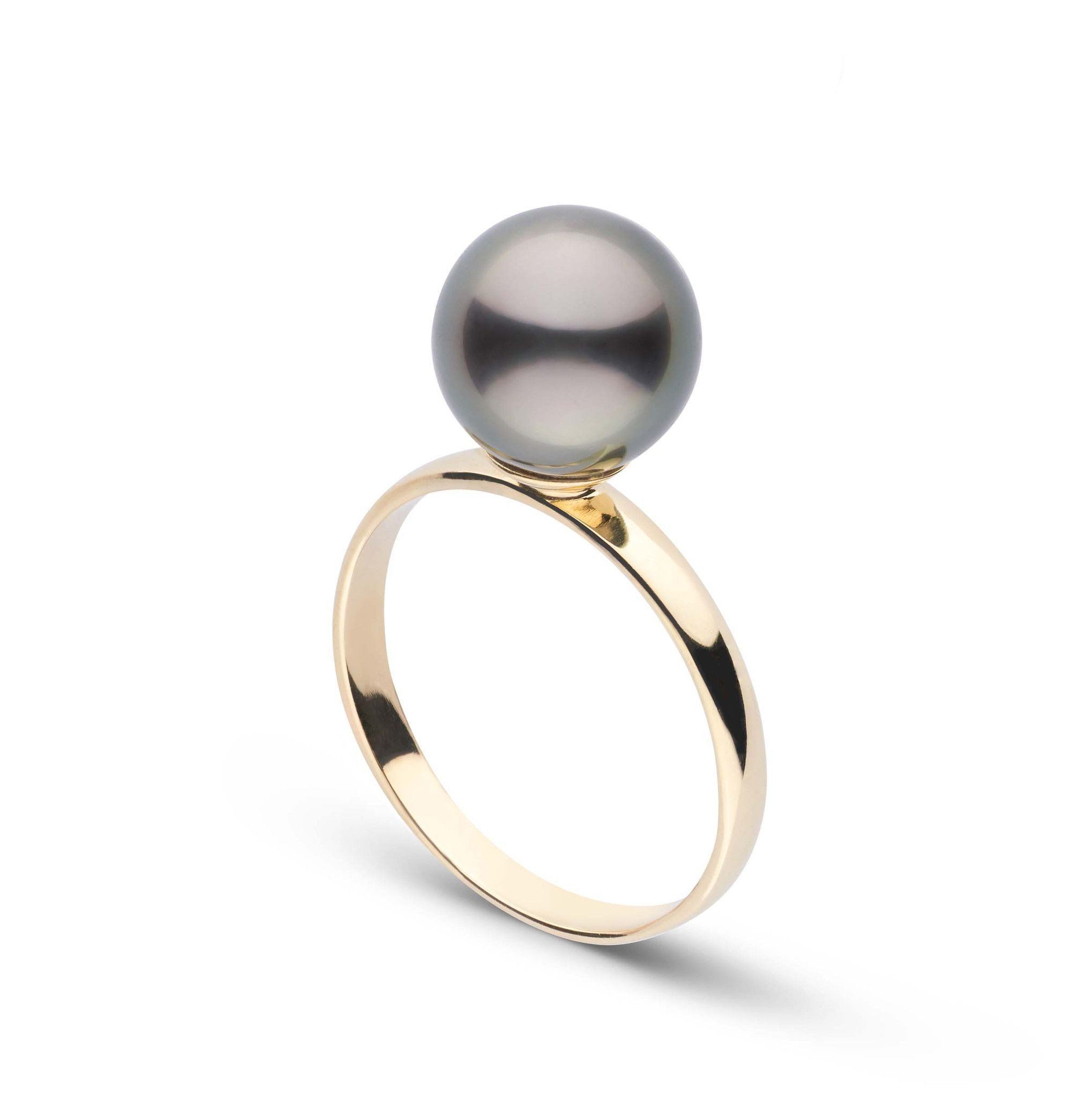 In a similar style to the classic diamond solitaire, this 8.0-9.0 mm AAA quality Tahitian pearl ring showcases the pure organic beauty of a single, exotic Tahitian pearl. The flawless pearl appears to float above the gold, yet is securely attached by a strong post. The classic-style ring features a 2.5 mm band, creating a solid piece of jewelry.
