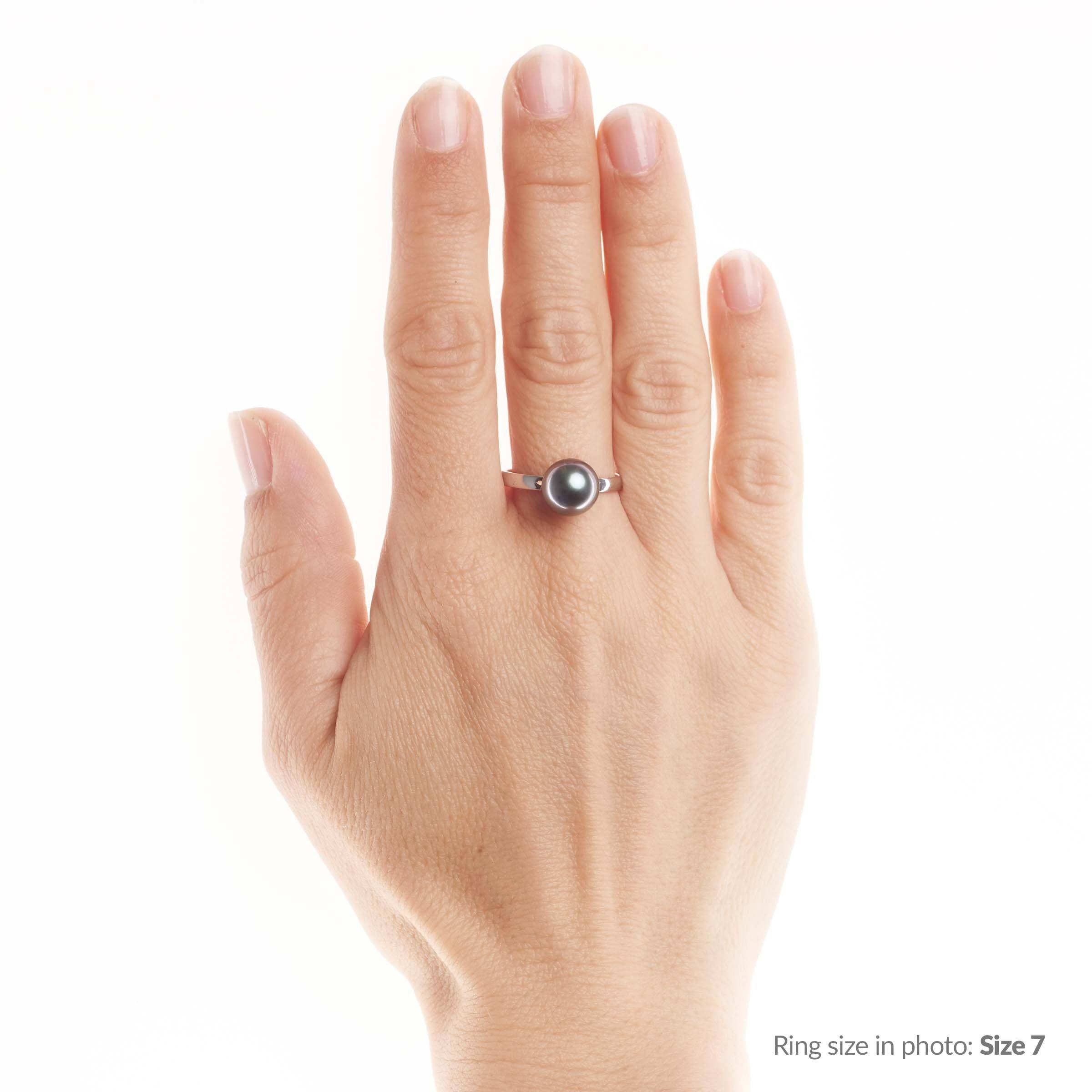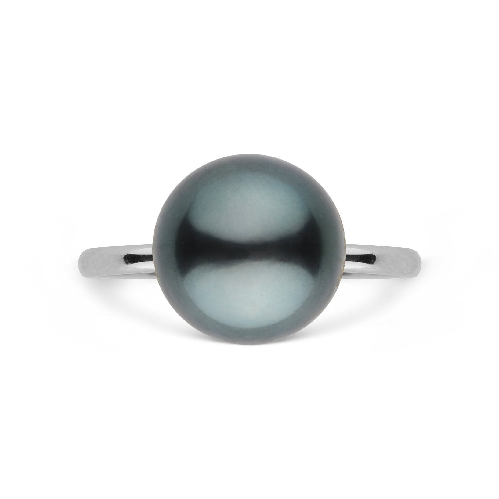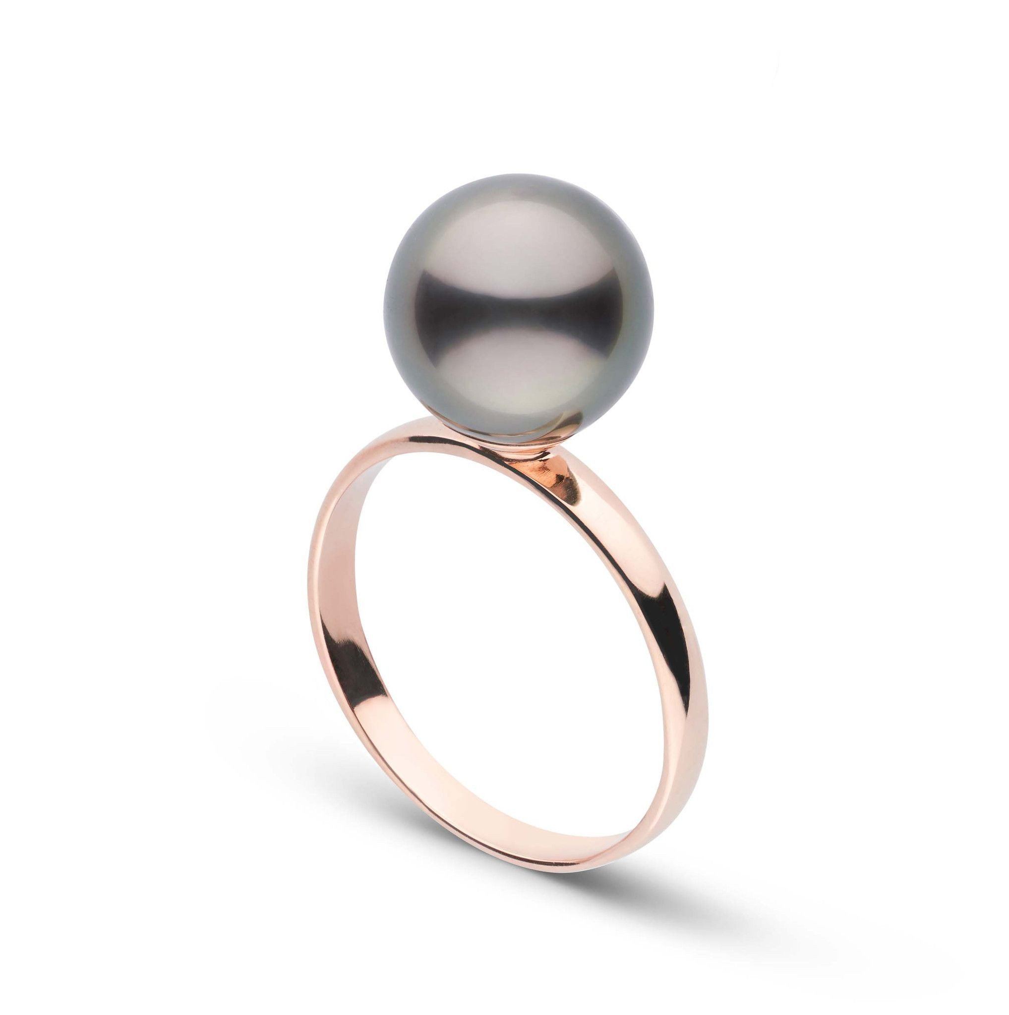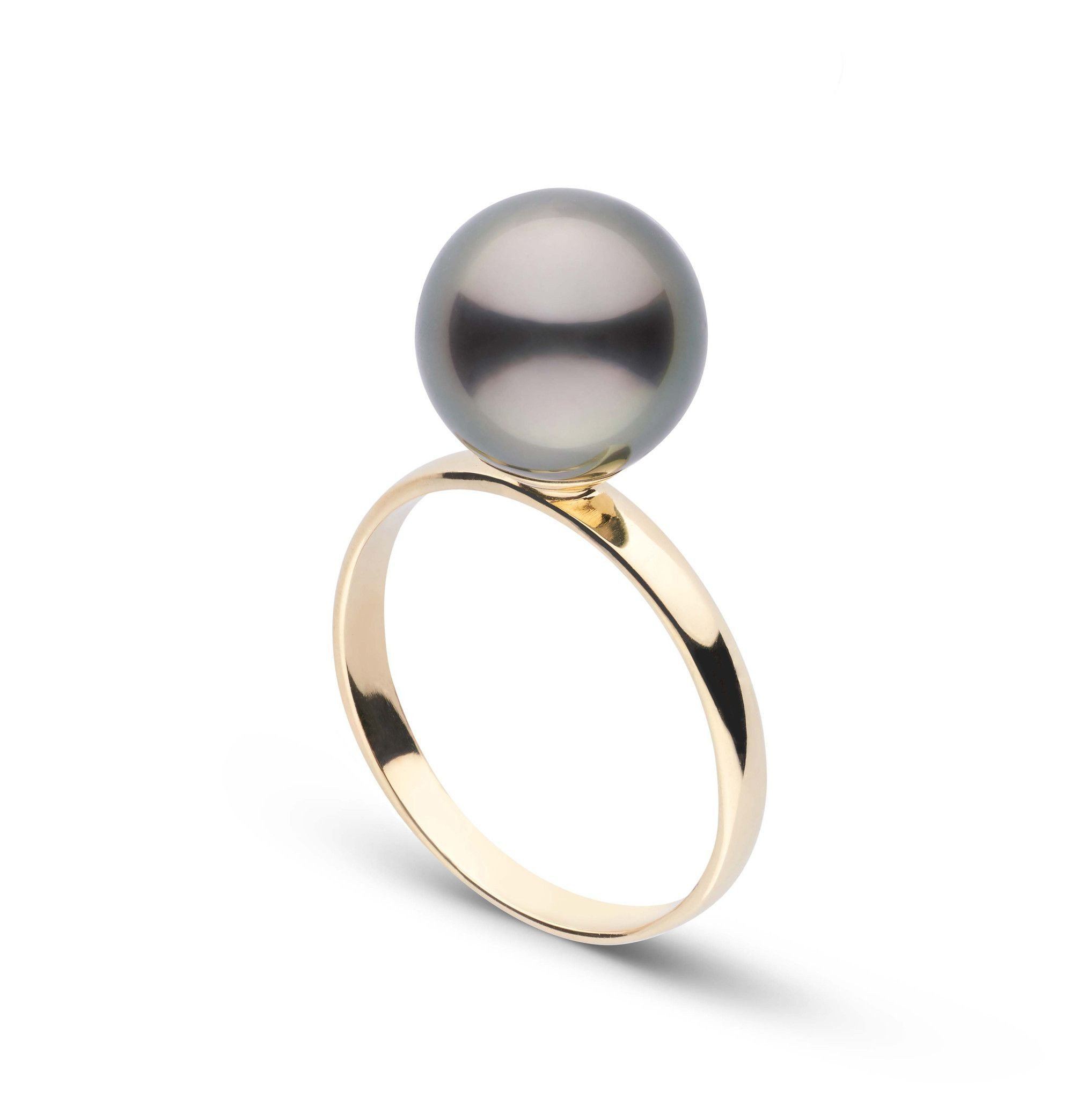 In a similar style to the classic diamond solitaire, this 9.0-10.0 mm AAA quality Tahitian pearl ring showcases the pure organic beauty of a single, exotic Tahitian pearl. The flawless pearl appears to float above the gold, yet is securely attached by a strong post. The classic-style ring features a 2.5 mm band, creating a solid piece of jewelry.