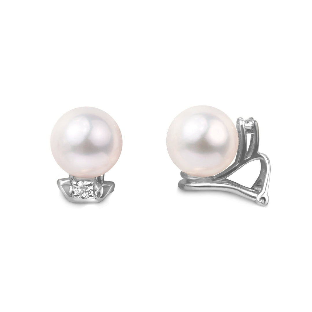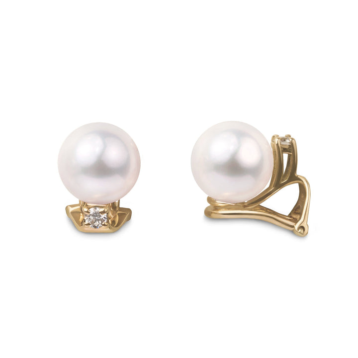 This beautiful set of earrings is comprised of two of our finest, AAA quality 8.0-8.5 mm Japanese akoya pearls. These pearls are perfectly round, with excellent luster and clean, blemish-free surface. The pearls are accented with brilliant round-cut, VS1-G quality diamonds totaling 0.10 cttw set in solid 14-karat gold with a backing for non-pierced ears.