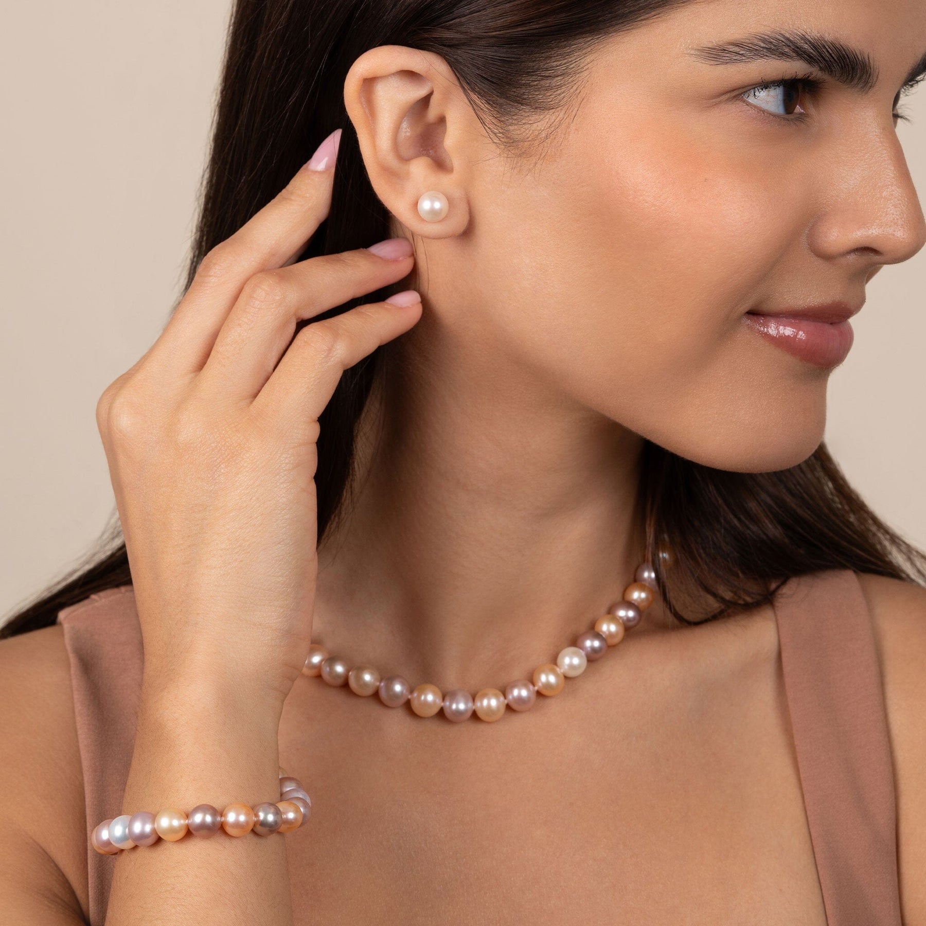 This colorful three-piece set includes a necklace, bracelet, and matching stud earrings crafted with 8.5–9.0 mm AA+ quality freshwater pearls in a natural palette of white, pink, and lavender. The larger pearl size adds a bold yet elegant feel, while the soft pastel tones offer warmth, playfulness, and sophistication in equal measure.