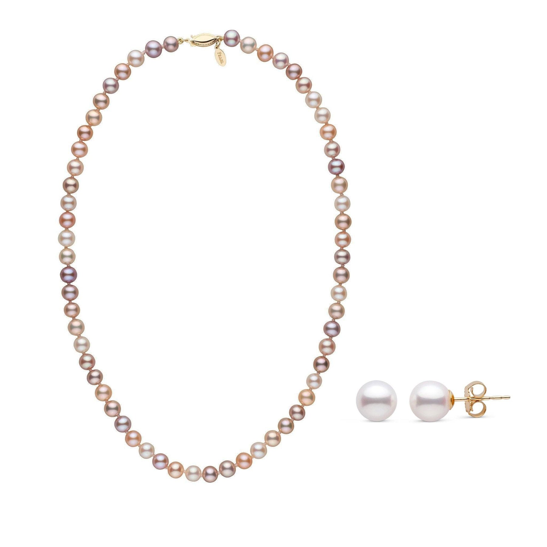 This two-piece set features our finest natural-color multicolor freshwater pearls—Freshadama grade—offered in a necklace and matching stud earrings. Representing the top 0.01% of each annual freshwater pearl harvest, these pearls are carefully selected for their exceptional luster, near-perfect roundness, and vibrant natural hues of lavender, peach, and white.