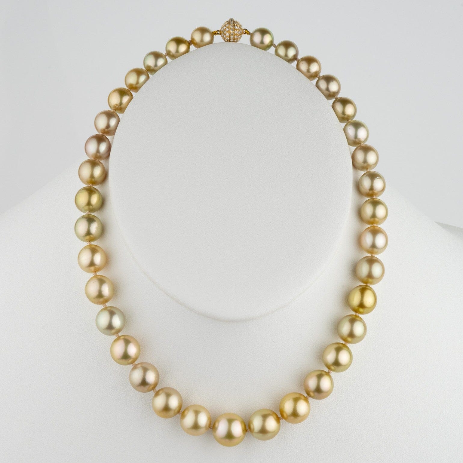 This Fijian pearl strand features beautifully matched pearls measuring 9.3–12.8 mm, graduating smoothly along a 16.5-inch length. The pearls display a rare golden body color with subtle green overtones, a distinctive hue that has become synonymous with the finest Fijian pearls. The pearls are very well matched, with a sharp, reflective luster that highlights the depth and complexity of the color.