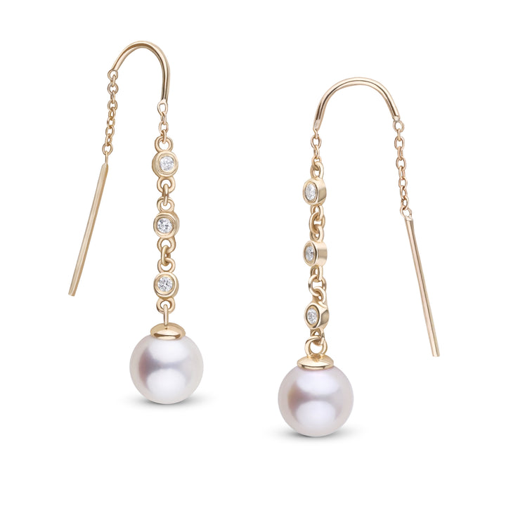 Elevate your style with these beautiful diamond threader earrings. Crafted in 14 karat gold, the delicate chain hangs from a curved bar which will keep these threader earrings in place. Set with 0.12 cttw VS1-G diamond and finished with 7.5-8.0 mm Freshadama freshwater pearls, these earrings are a "fan favorite" item.