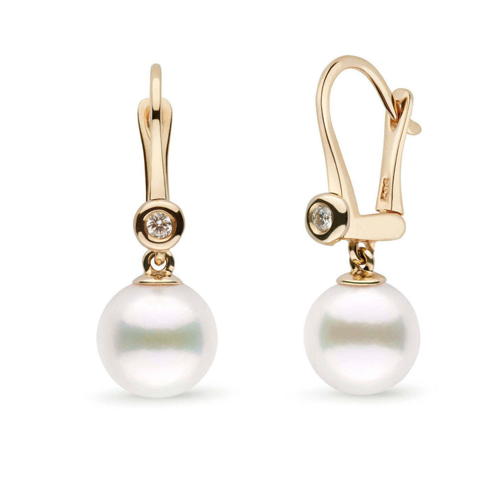 These beautiful earrings are simple, elegant and classic. Made with the finest white freshadama 9.0-10.0 mm pearls, these dangle earrings are a perfect complement to any of our freshadama strands. These perfectly round pearls are suspended from solid 14-karat gold leverback earrings, set with G-VS1 quality_diamonds totaling 0.06 carats.