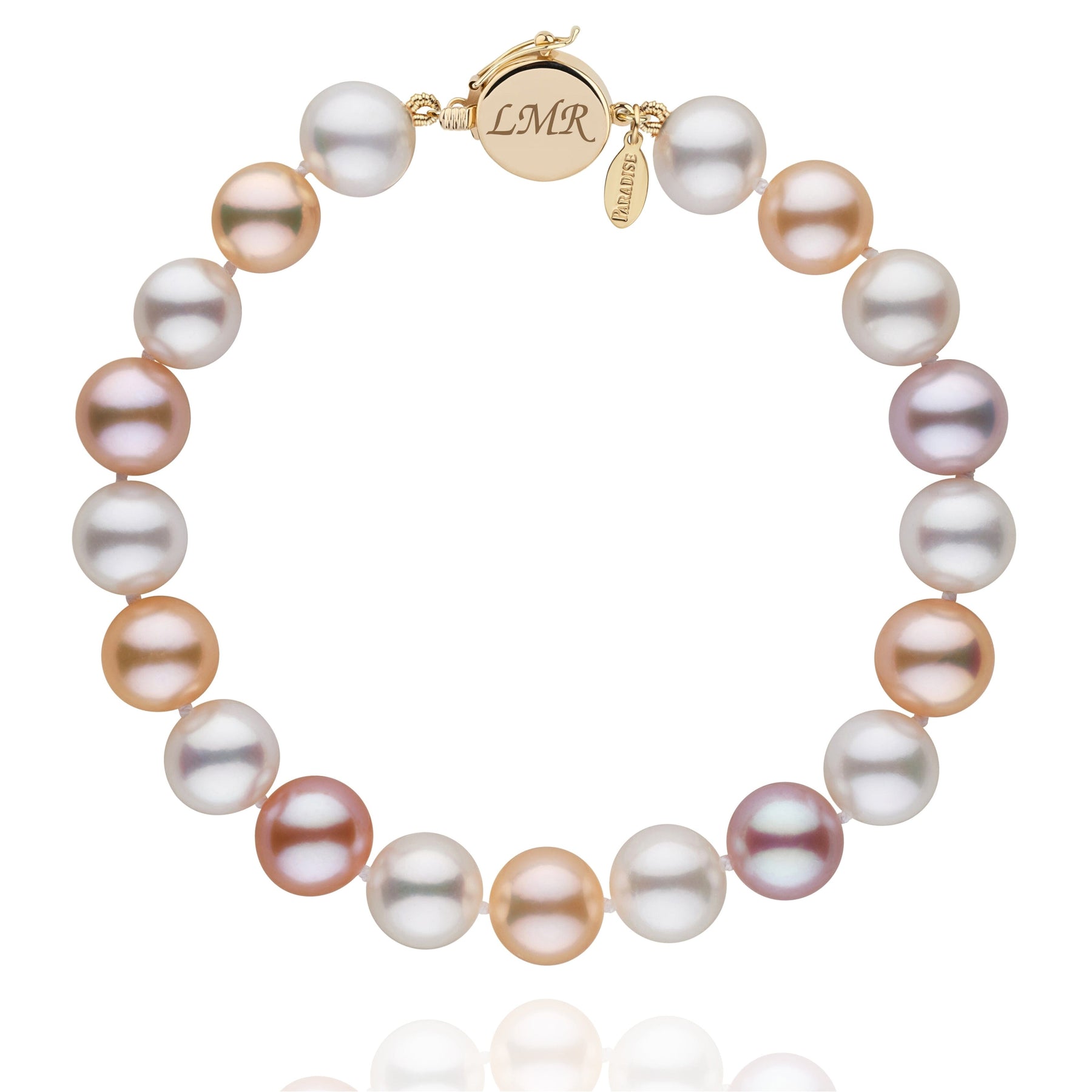 Perfectly round and highly lustrous 8.5-9.0 mm Freshadama Freshwater pearls are used to create this elegant bracelet. The pearls are individually knotted on silk thread and the strand is finished with a solid, 14-karat gold clasp ready for engraving. The clasp comes with an added safety catch so you will never lose your pearls.