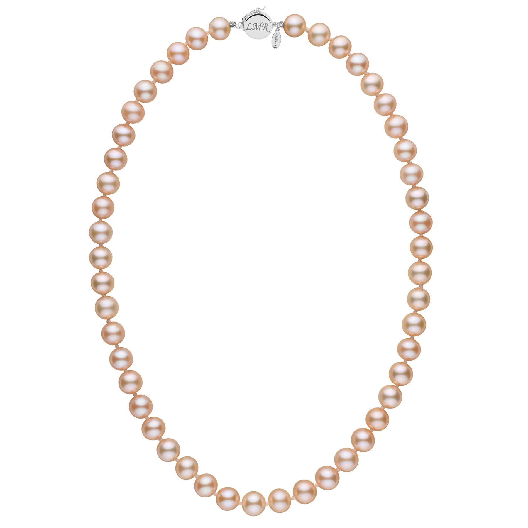 The necklace is strung with 8.5–9.0 mm Freshadama-grade freshwater pearls—the top 0.01% of the annual harvest. These pearls are perfectly round, exceptionally lustrous, and hand-selected for their mirror-like glow and clean surfaces. Each pearl is individually knotted on twin silk in our Los Angeles studio. The strand is finished with a custom round solid 14 karat gold clasp designed for laser engraving, complete with a built-in safety catch for secure wear.