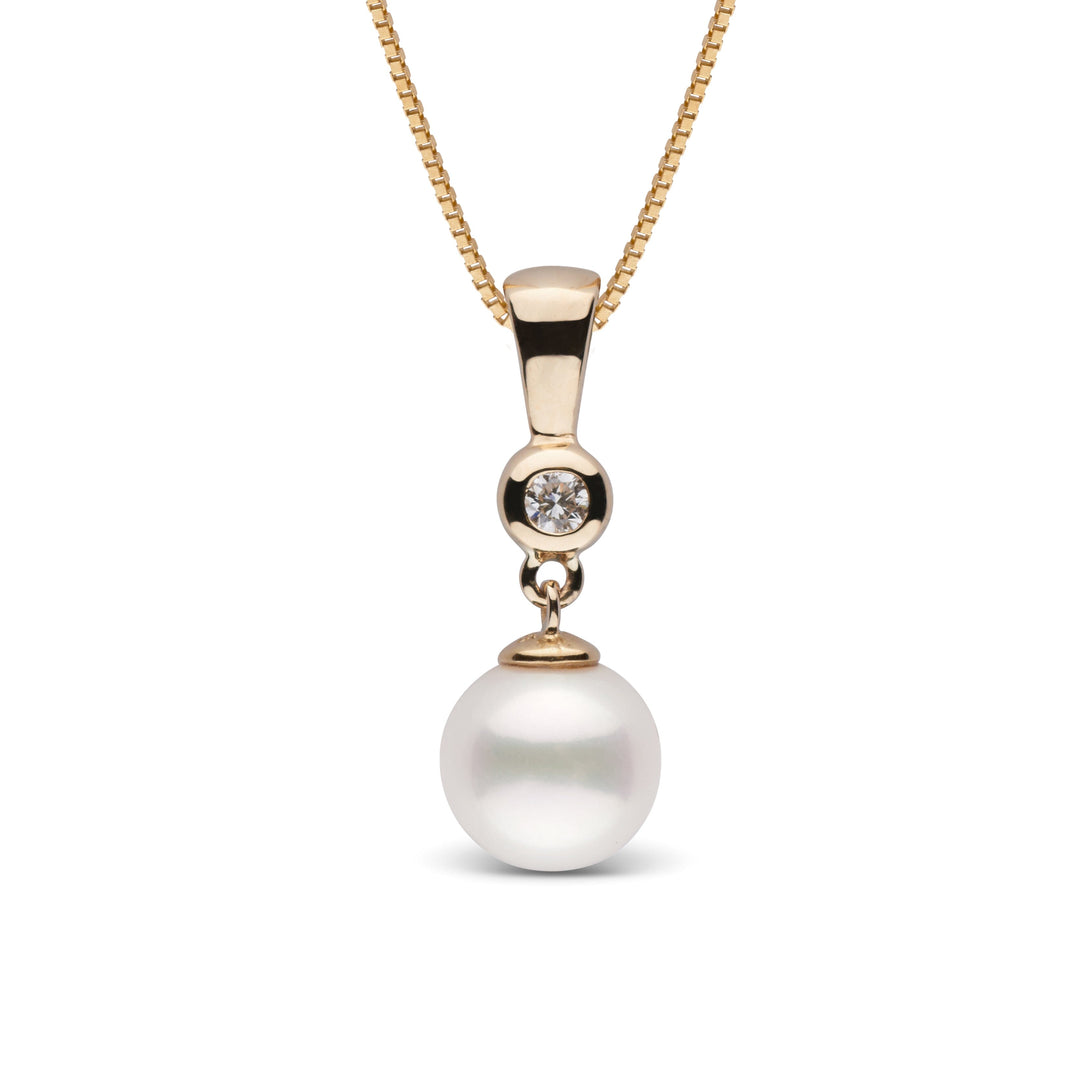 This elegant pendant features a radiant 9.0-10.0 mm white freshadama pearl accented by single diamond solitaire of exceptional quality (VS1 G). This pendant is a timeless family heirloom in waiting.