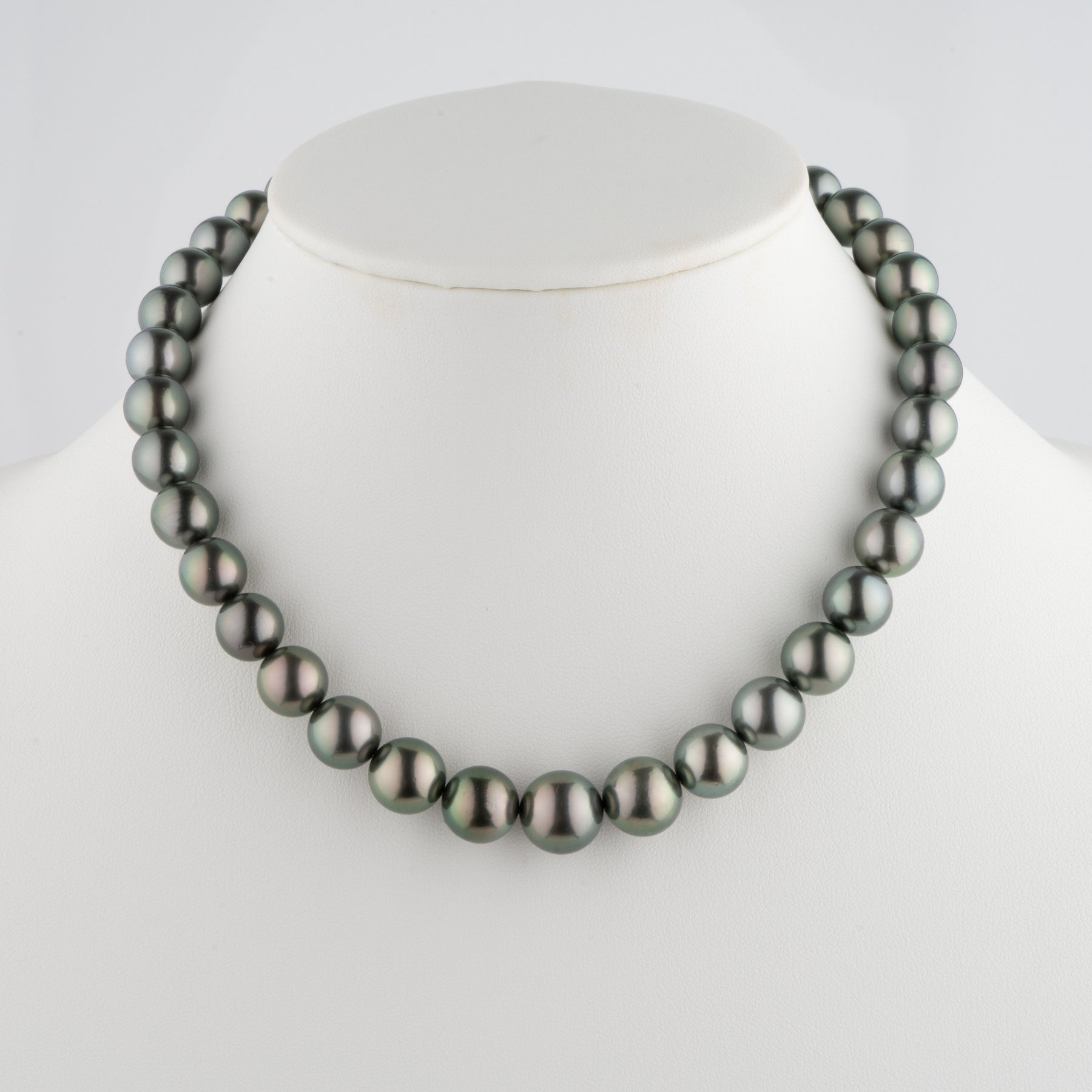 This one-of-a-kind necklace is composed of round, AAA quality Tahitian pearls measuring 10.0-13.4 mm in diameter and approximately 18 inches in length including the clasp.