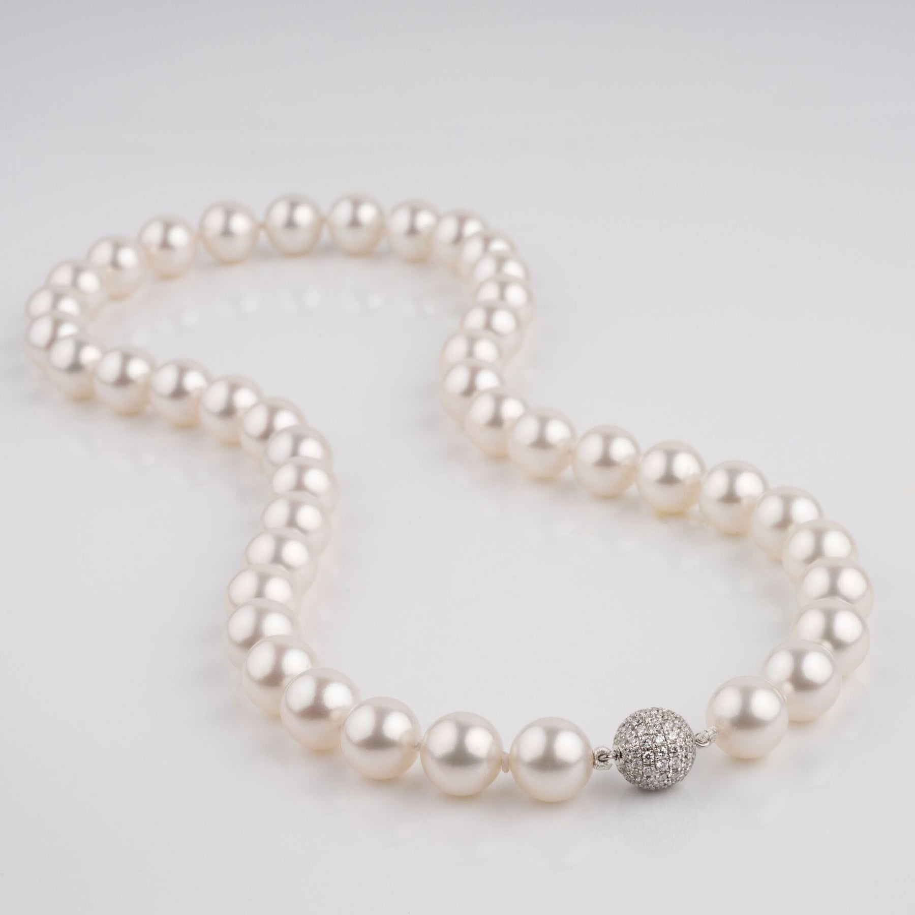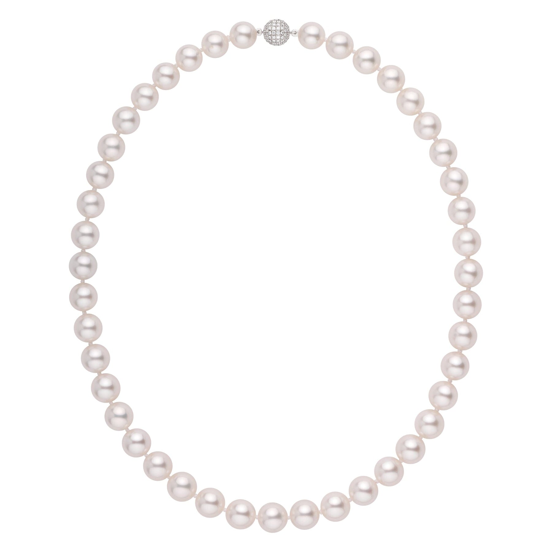 The clasp is crafted in 18K white gold and set with 114 diamonds totaling 0.86 carat. It complements the pearls without distraction and adds a final touch of refinement while ensuring the security of the strand. At 18 inches in length, this necklace drapes with timeless proportion and elegance.