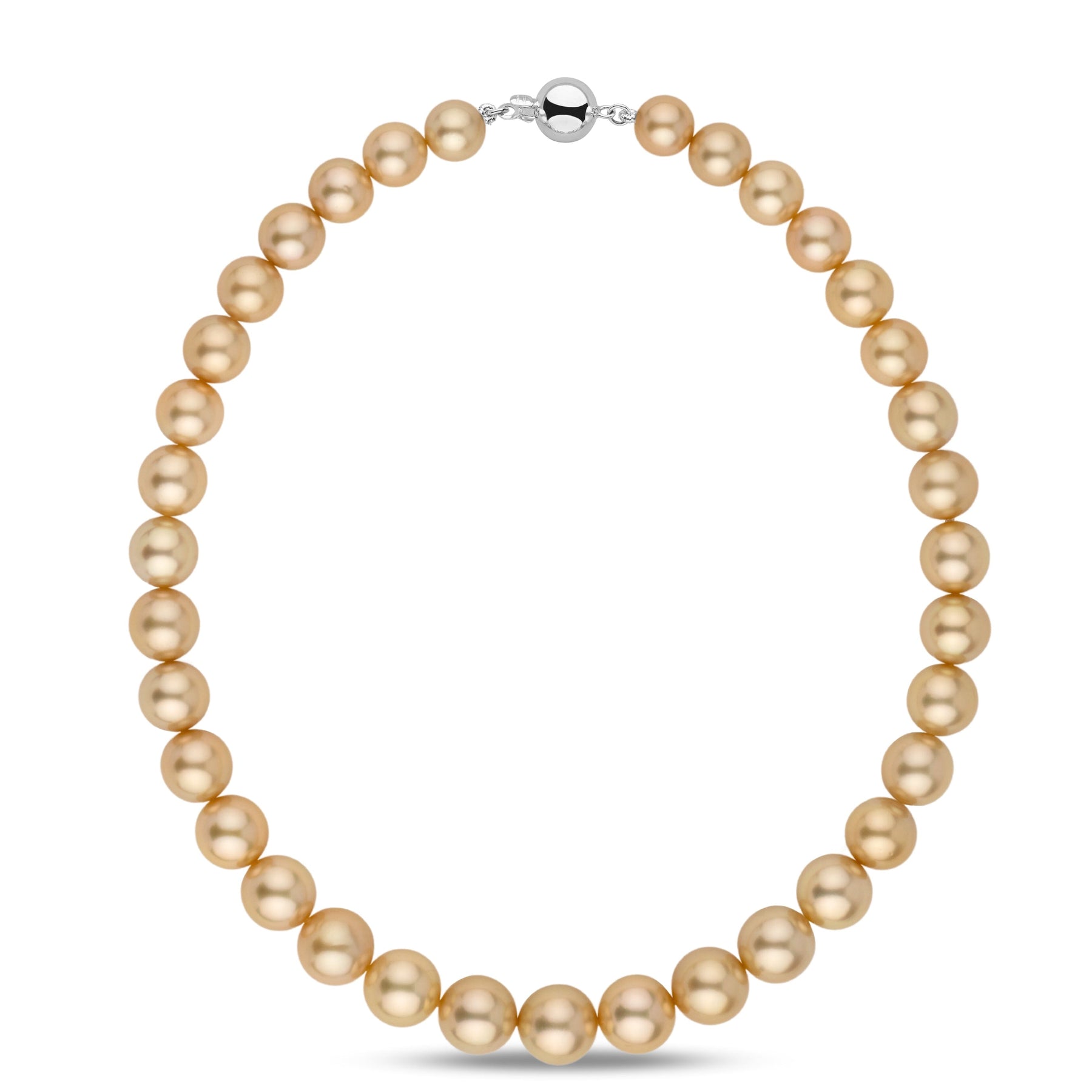The golden South Sea pearls measure 10.0-13.2 mm in size, the large size a trademark feature of South Sea pearls.