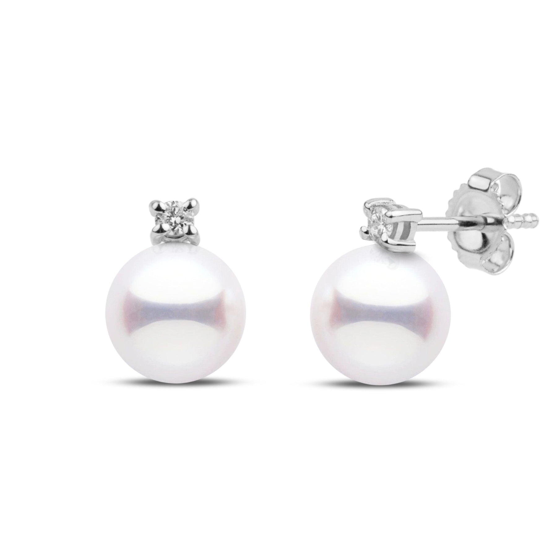 These earrings from our Starlight Collection feature 7.0–7.5 mm Hanadama akoya pearls from Japan. Their perfectly round shapes, mirror-like luster, and bright, smooth surfaces are paired with round brilliant-cut G-VS1 diamonds totaling 0.06 cttw, set in solid 14k gold.