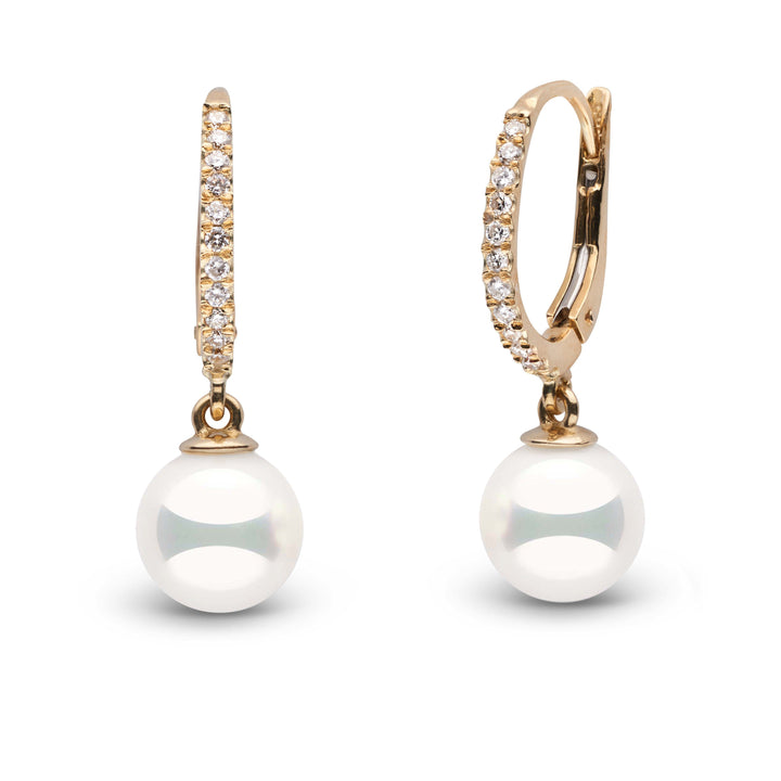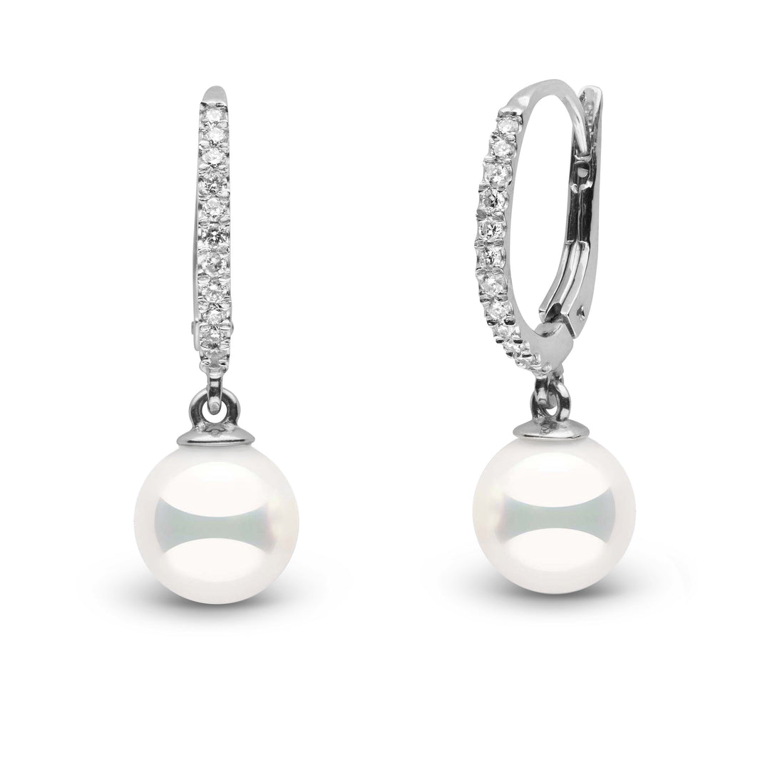You will never go wrong with the sparkling combination of fine-quality diamonds and certified, top-grade hanadama akoya pearls. This popular earring design features lustrous 7.5-8.0 mm Natural White Akoya pearls dangling below an impressive 14-karat gold setting with 11 sparkling diamonds on each ear. There are 22 diamonds of VS1-GH quality with a total carat weight of 0.22 cttw.