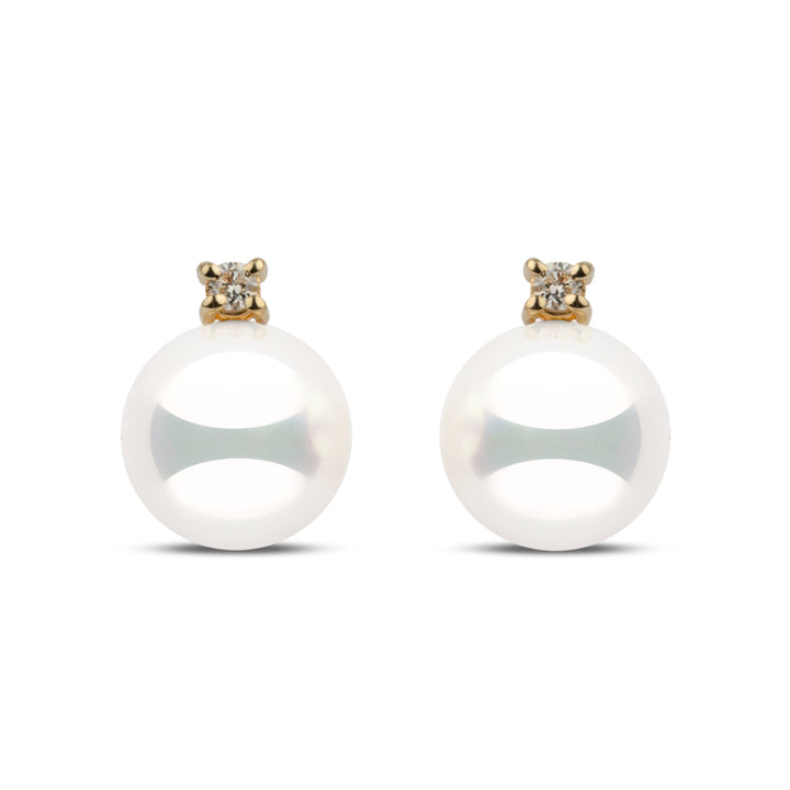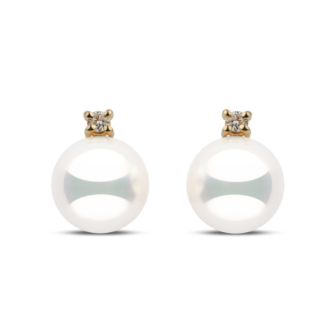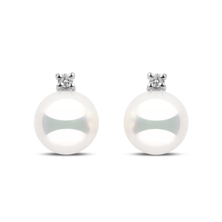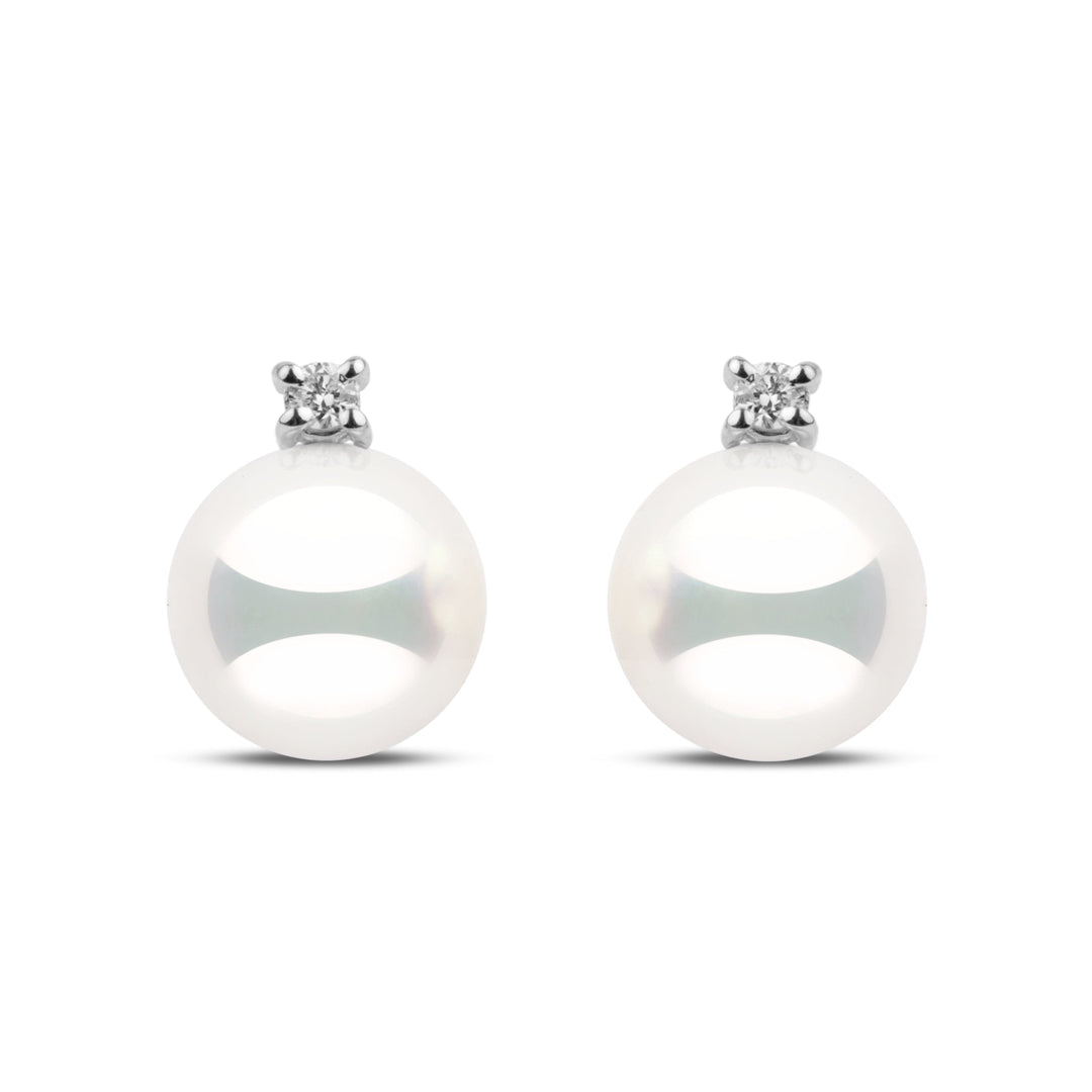 These earrings from our Starlight Collection feature the rarest natural white 8.5–9.0 mm Hanadama akoya pearls. Perfectly round with luminous luster and smooth, bright surfaces, each pearl is accented with round brilliant-cut G-VS1 diamonds totaling 0.06 cttw, set in solid 14k gold.