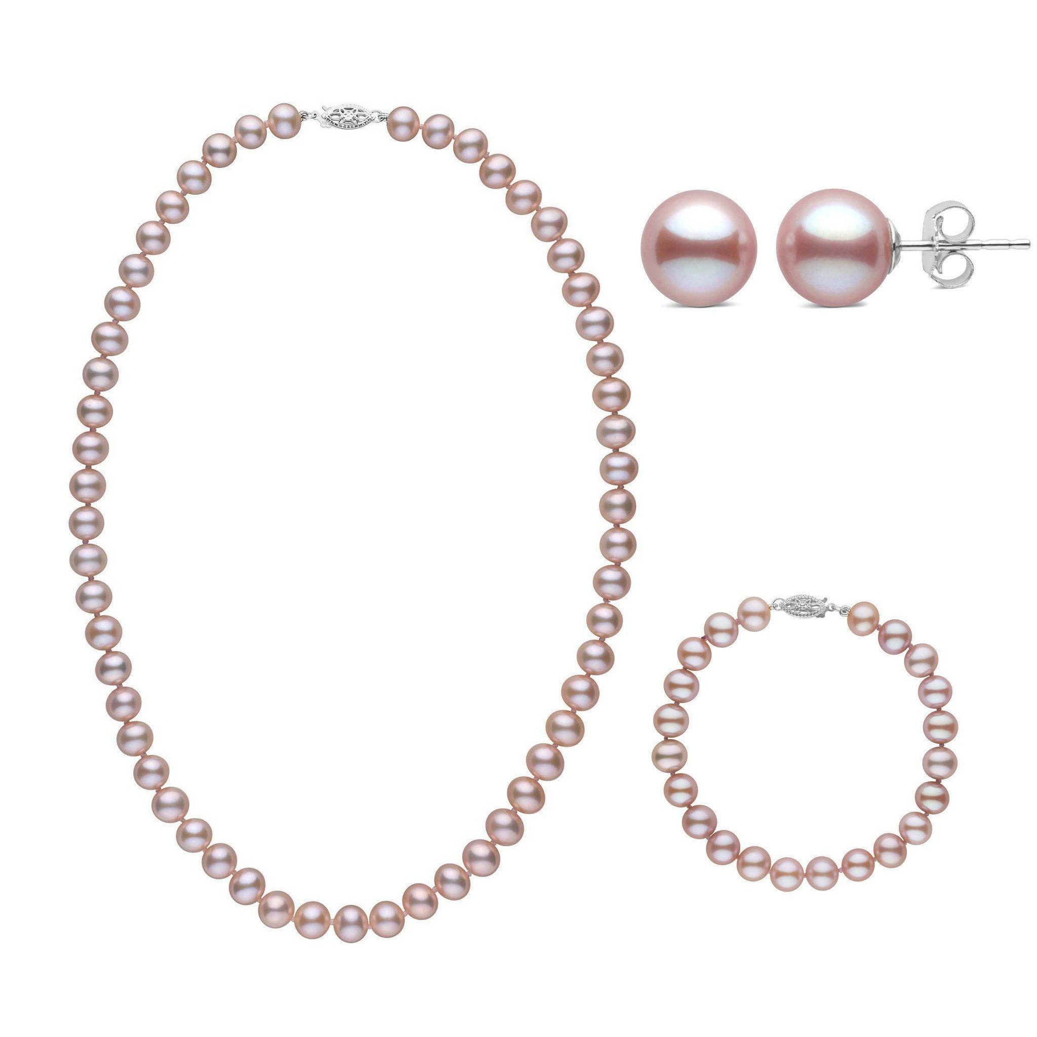 his three-piece set features a necklace, bracelet, and matching stud earrings crafted with 7.5–8.0 mm AA+ quality freshwater pearls in their naturally occurring lavender color. These soft silvery-violet hues offer a subtle, elegant alternative to traditional white—perfect for adding a touch of color to any collection.