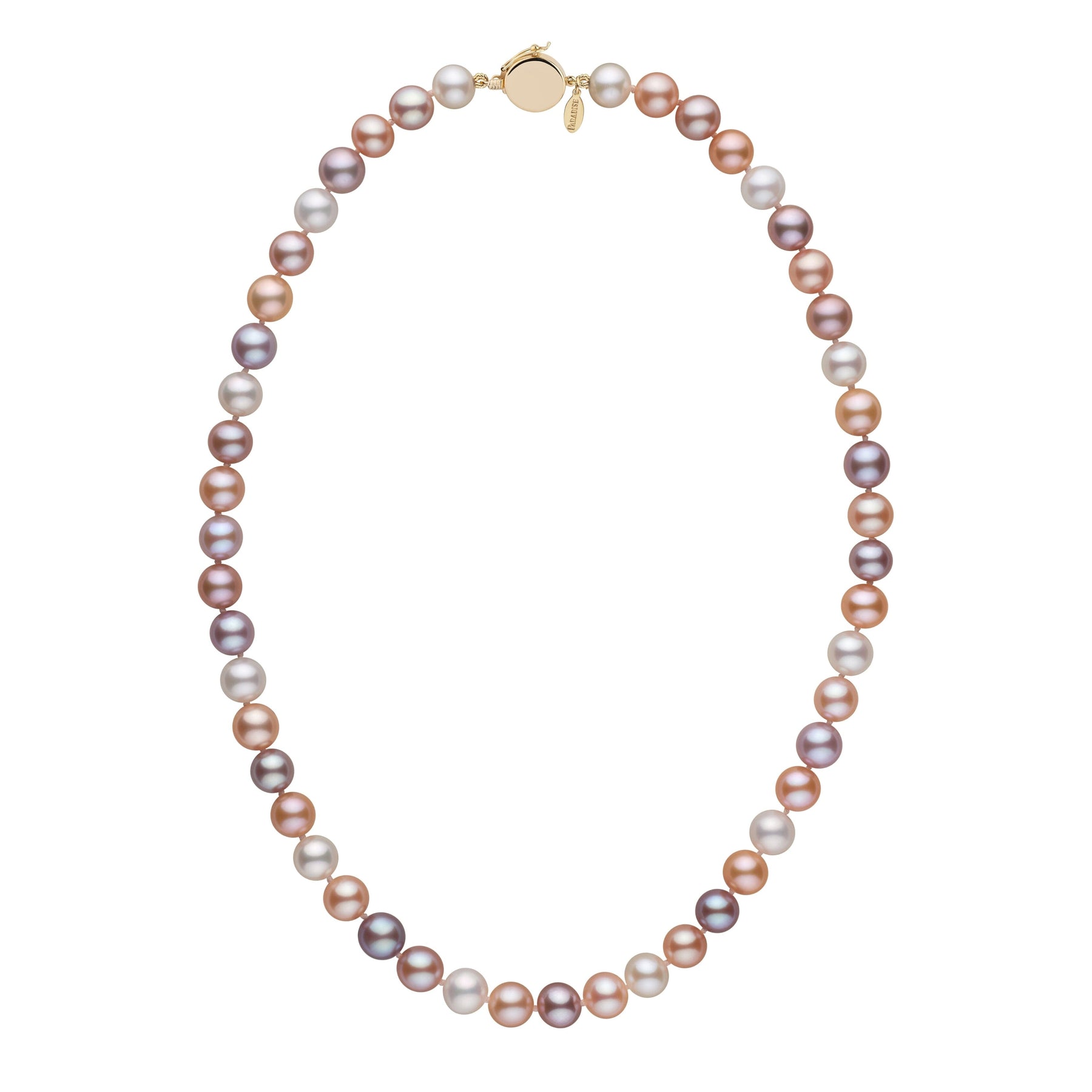 Perfectly round and highly lustrous 7.5-8.0 mm Freshadama Freshwater pearls are used to create this elegant 18-inch necklace. The pearls are individually knotted on silk thread and the strand is finished with a solid, 14-karat gold clasp ready for engraving. The clasp comes with an added safety catch so you will never lose your pearls.