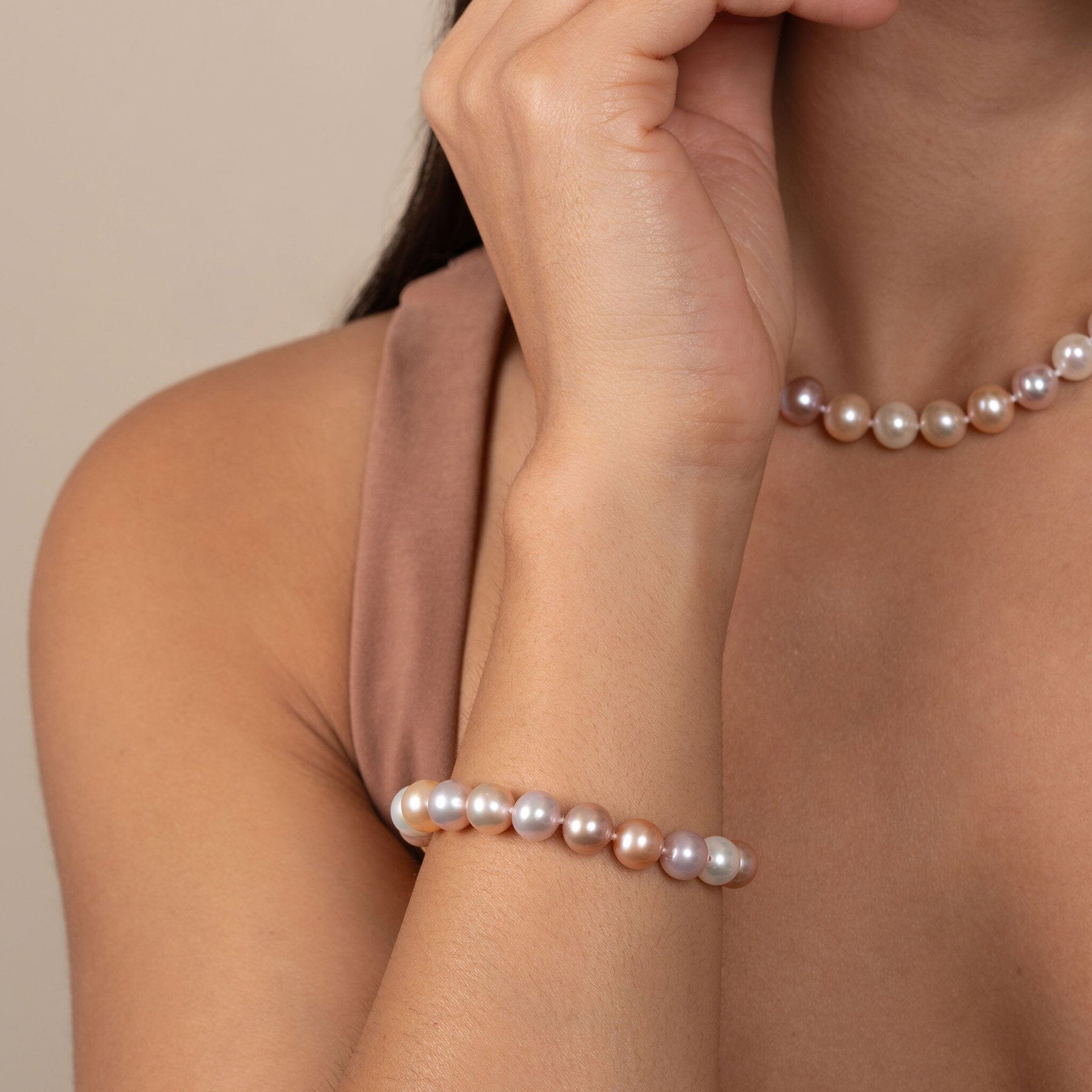 This lovely bracelet is composed of 8.5-9.0 mm multicolor freshwater pearls. This is a medium-large size and perfectly suited for a bracelet. These AAA quality, fine round pearls exhibit brilliant, rich overtones, with smooth, lustrous surfaces.