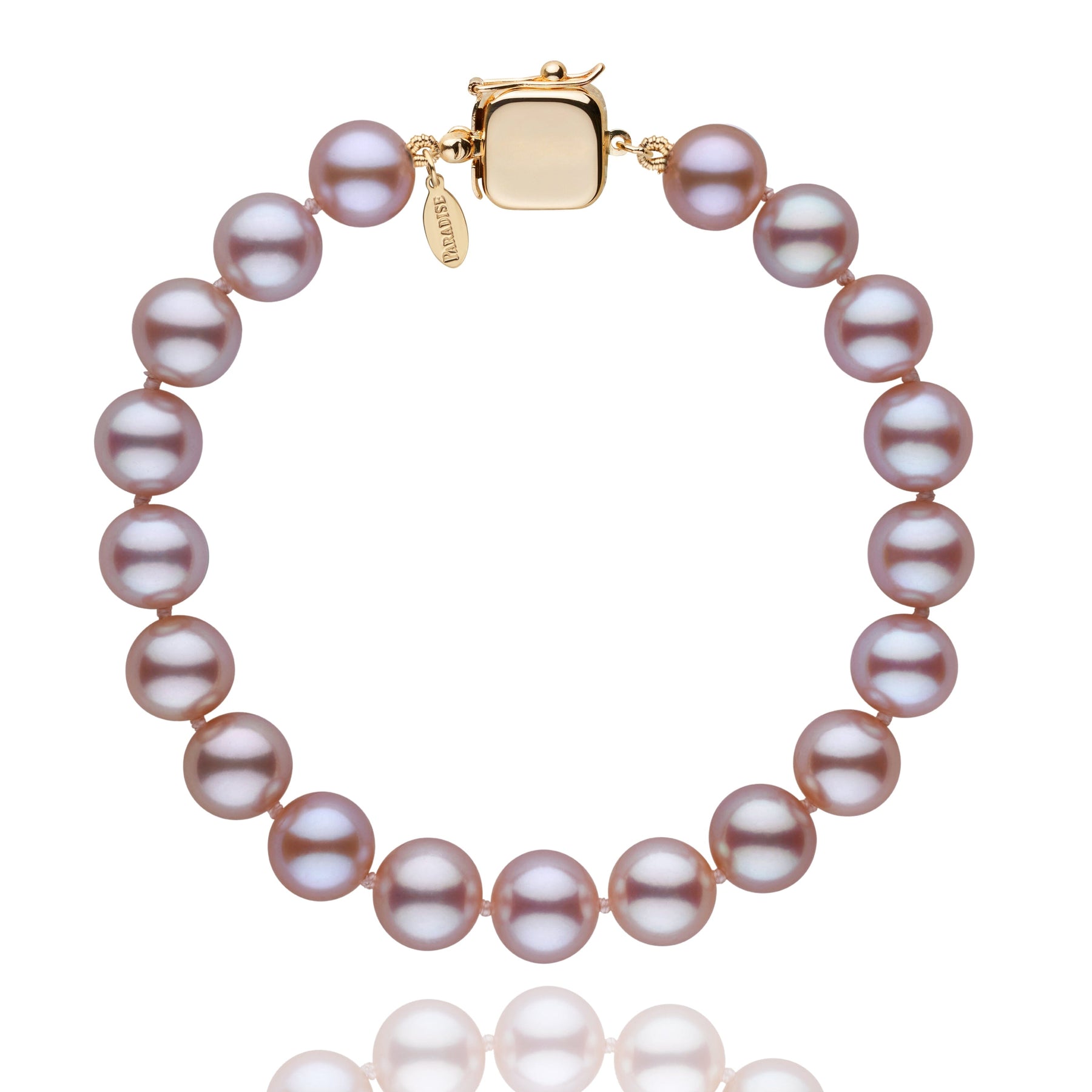 Perfectly round and highly lustrous 8.5-9.0 mm Freshadama Freshwater pearls are used to create this elegant bracelet. The pearls are individually knotted on silk thread and the strand is finished with a solid, 14-karat gold clasp ready for engraving. The clasp comes with an added safety catch so you will never lose your pearls.
