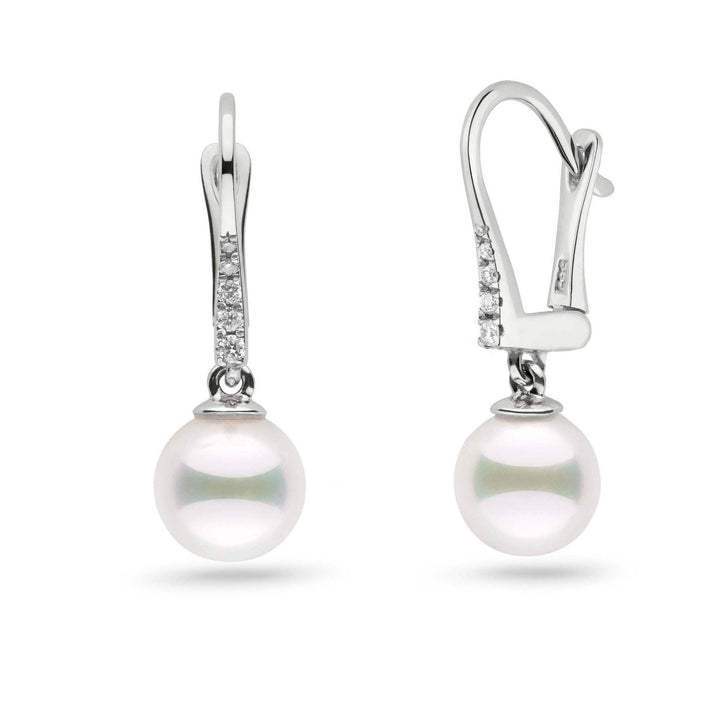These lovely pearl earrings feature perfectly round akoya pearls. The sturdy, 14-karat gold leverback style fits securely on the ears and creates an elegant look. The pearls are accented with pave-set diamonds weighing 0.085 cttw.