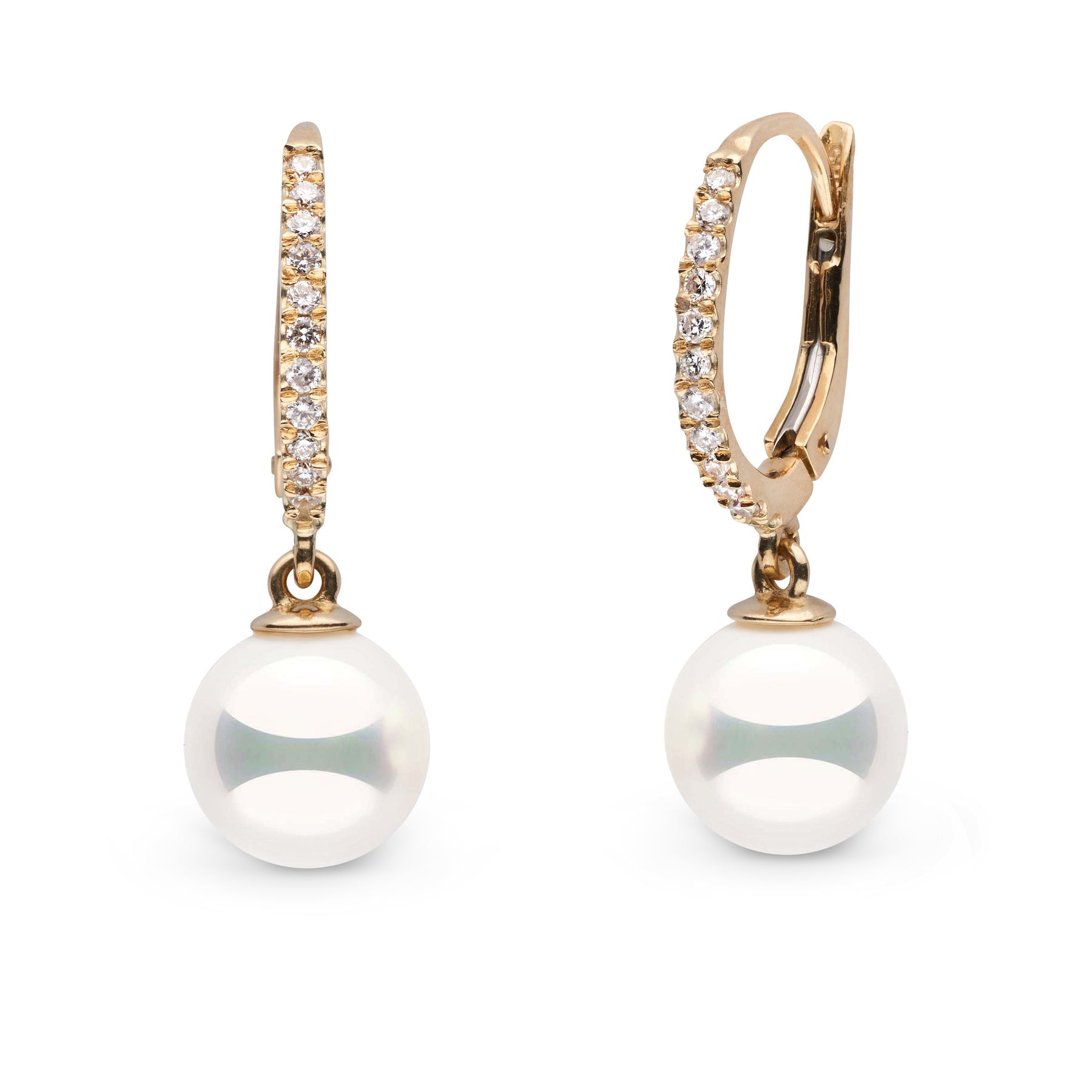 You will never go wrong with the sparkling combination of fine-quality diamonds and certified, top-grade hanadama akoya pearls. This popular earring design features lustrous 8.5-9.0 mm natural white akoya pearls dangling below an impressive 14-karat gold setting with 11 sparkling diamonds on each ear. There are 22 diamonds of VS1-GH quality with a total carat weight of 0.22 cttw.