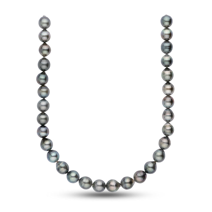 This one-of-a-kind strand features drop to baroque Tahitian pearls measuring 12.1–12.7 mm, with a dark gray body color accented by natural green and blue overtones. The strand is AA+ quality, showcasing strong luster and minimal surface imperfections.