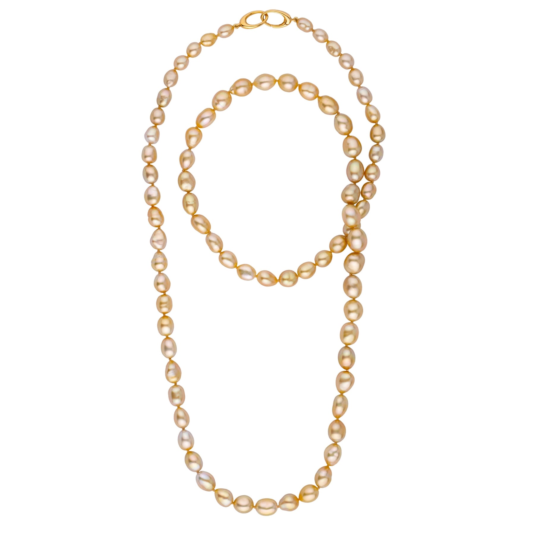 This Golden South Sea Keshi Pearl Necklace, composed of 78 pearls measuring 6.1–10.2 mm, is a strand of exceptional rarity. Keshi pearls are formed accidentally in the oyster without a nucleus, just like wild, natural pearls. The term “keshi” comes from the Japanese word for “poppyseed,” reflecting how small most keshi pearls are, which makes strands of this size all the more remarkable.