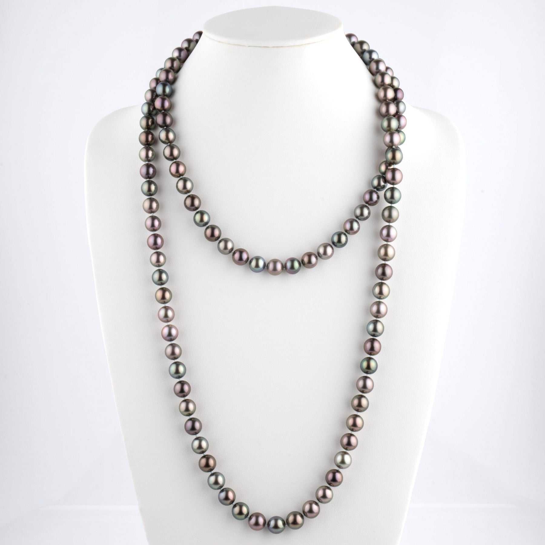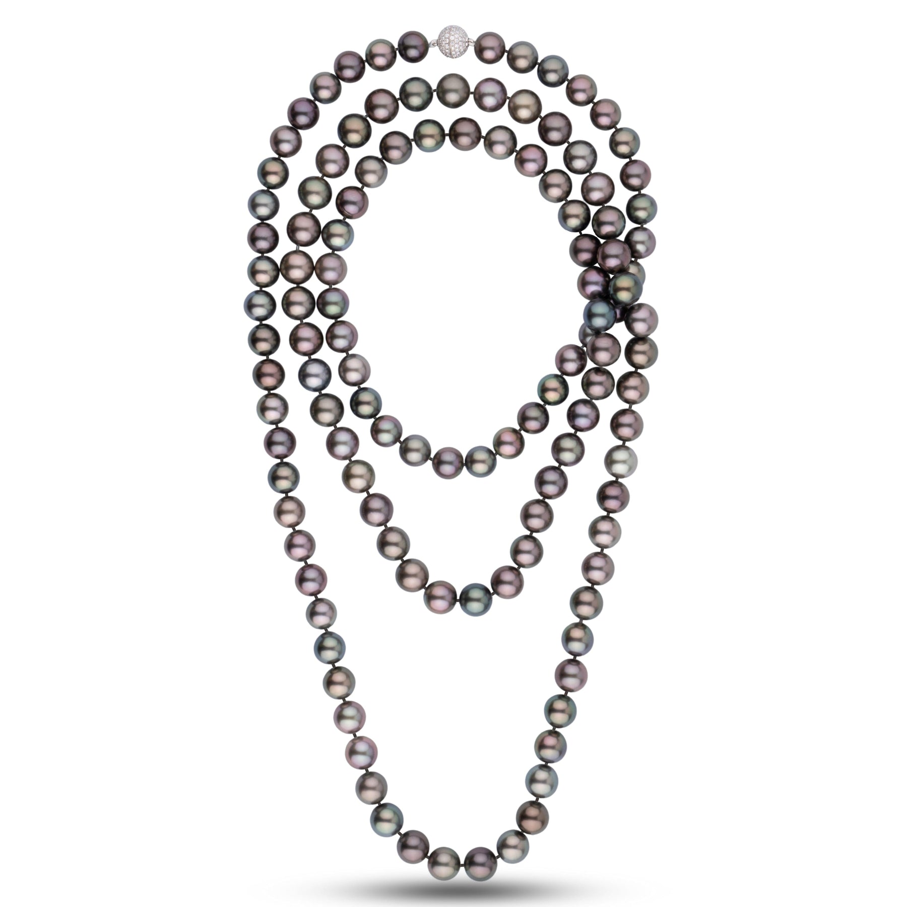 This Round Multicolor Tahitian Natural Color Cultured Pearl Necklace, composed of 118 pearls measuring 10.0–11.0 mm and weighing 51.9 momme, is an extraordinary collector’s strand. The pearls were hand-selected over years for their perfectly round shapes, thick nacre, exceptional luster, and a rare harmony of natural colors ranging from peacock and green to silver, blue, and aubergine. Assembled into a continuous 52.75-inch necklace, this strand represents the highest level of artistry in Tahitian pearl production.