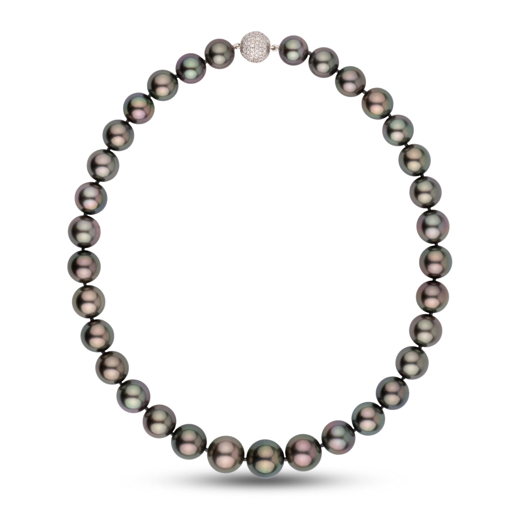 This Round Tahitian Natural Color Cultured Pearl Necklace, composed of 33 pearls measuring 10.6–13.6 mm and weighing 19.7 momme, is a strand of extraordinary rarity and beauty. Displaying the most coveted peacock overtone with an intensity that surpasses traditional AAA parameters, the pearls are perfectly round with exceptional luster, thick nacre, and deeply saturated natural bodycolors. Each pearl was carefully selected to achieve a strand that is truly one of a kind.