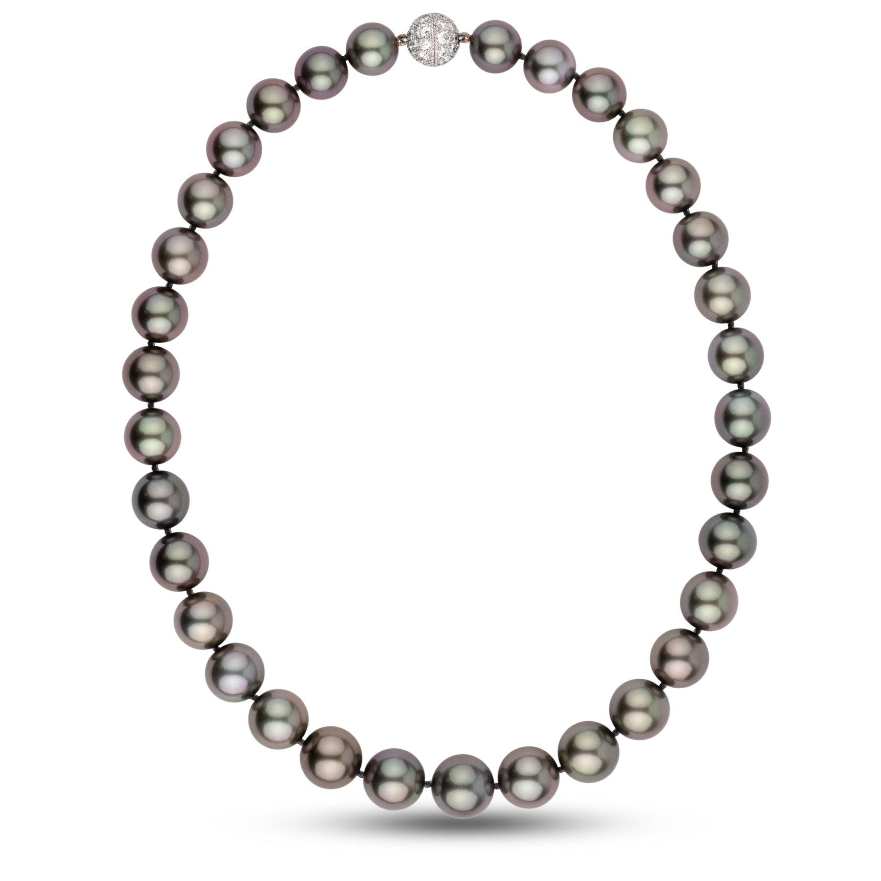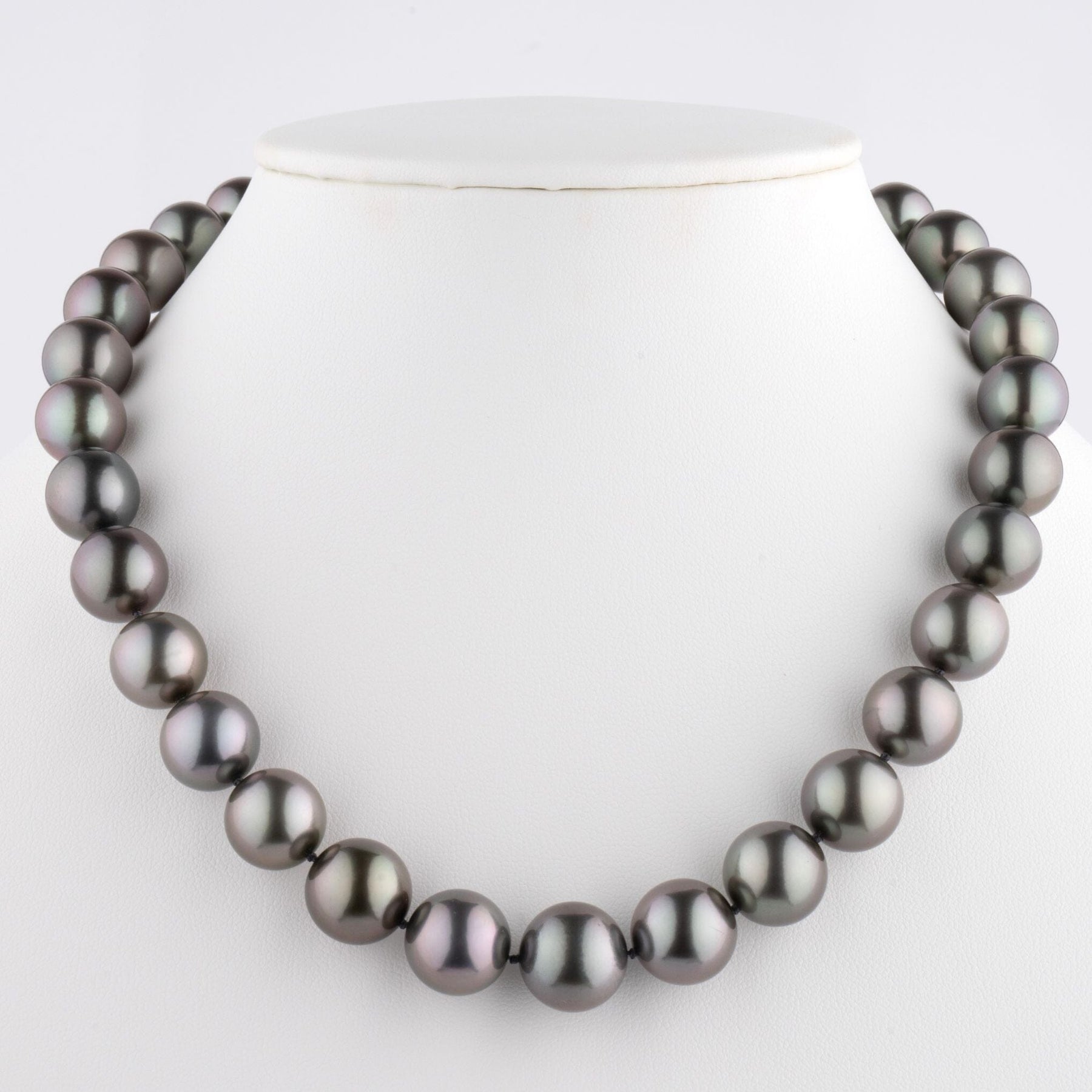 This Round Tahitian Natural Color Cultured Pearl Necklace, composed of 33 pearls measuring 12.0–14.5 mm and weighing 28.2 momme, is an extraordinary collector’s piece. Perfectly round with thick nacre, the pearls display exceptional luster and very dark bodycolors highlighted by intense aubergine overtones. This rare combination of size, saturation, and overtone places the necklace among the finest strands in its category ever produced.