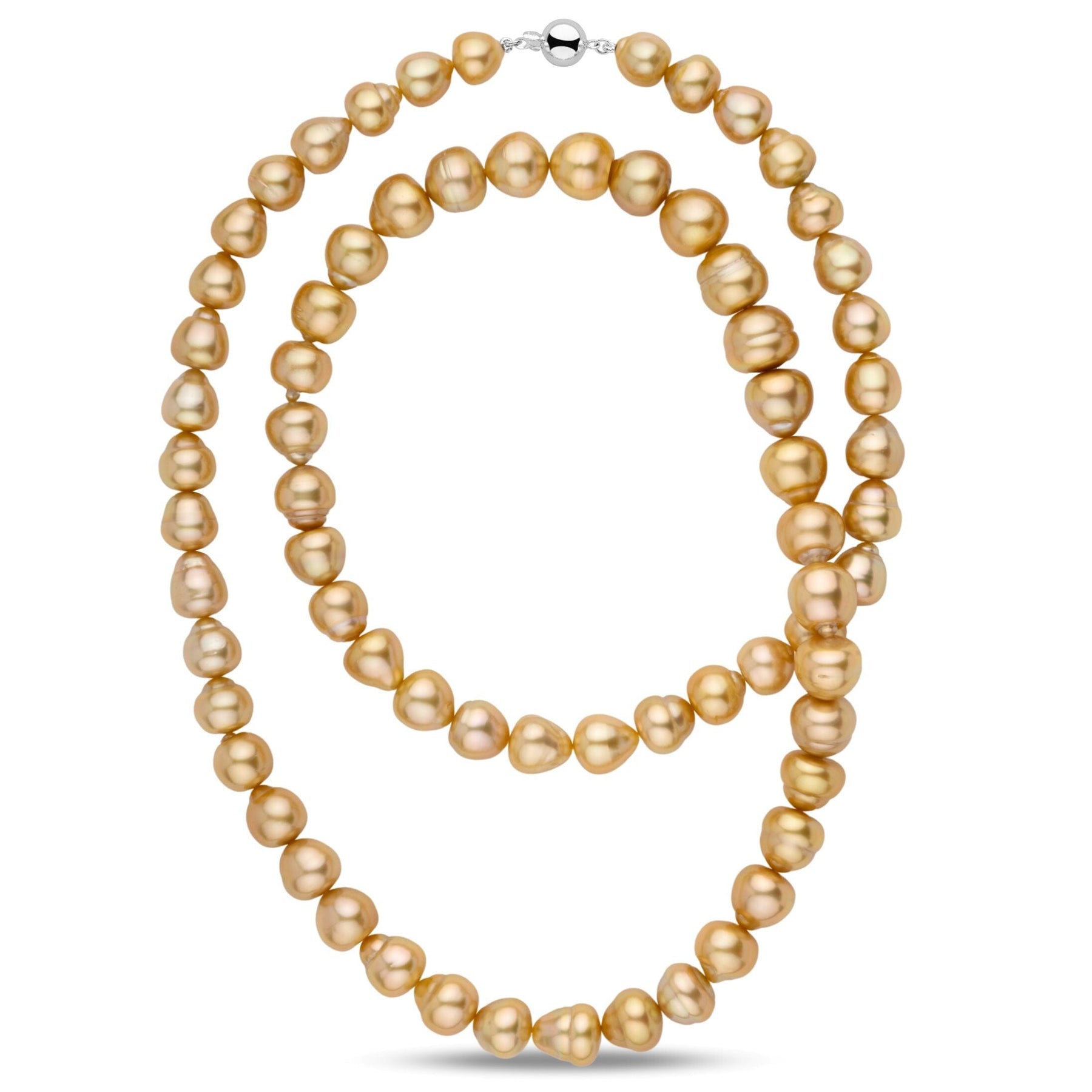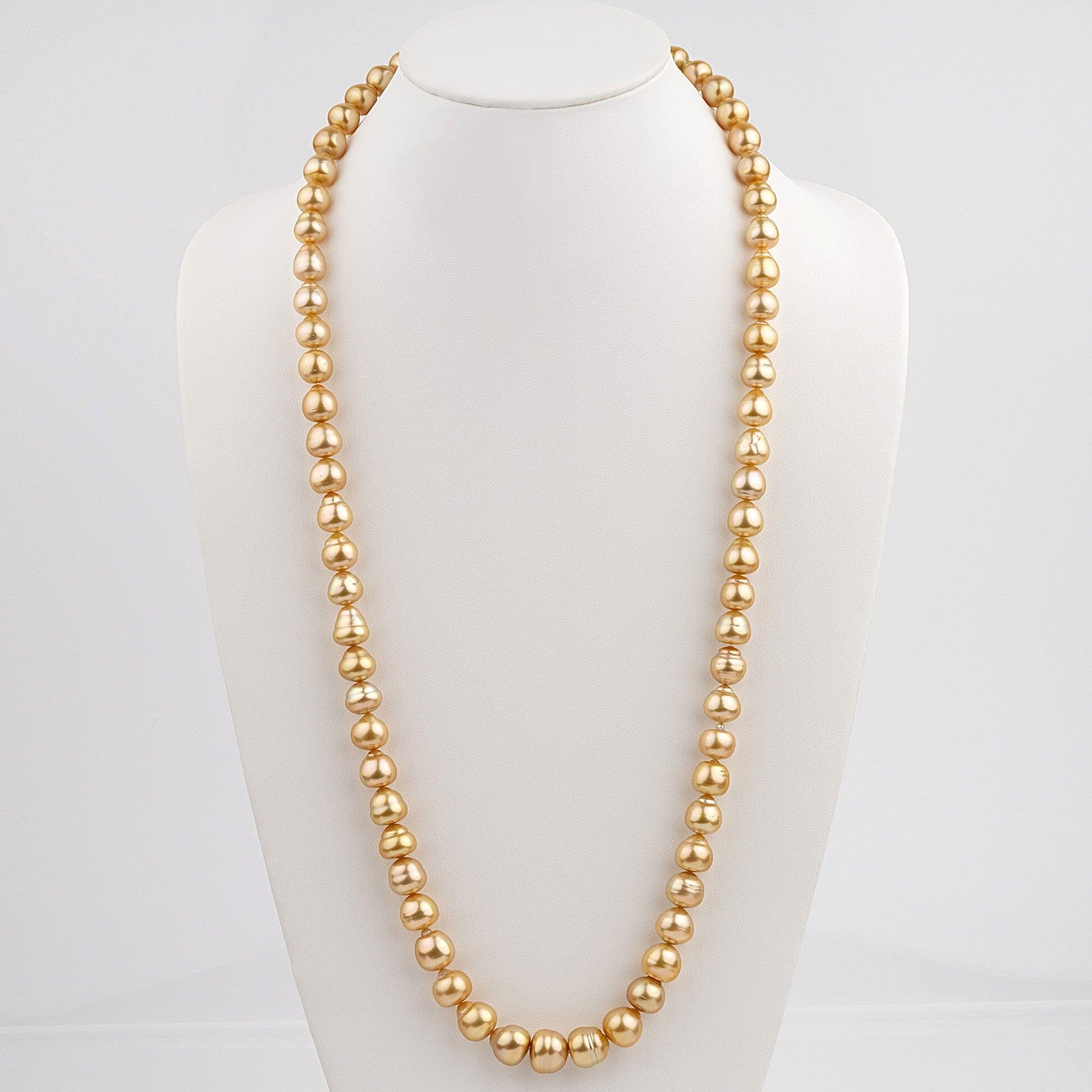 This exceptional 35-inch strand features Golden South Sea pearls ranging from 10.2–14.03 mm. The pearls exhibit a deep, warm golden bodycolor and consistent triangular drop shapes. The AAA quality rating reflects their high luster, thick nacre, and clean surfaces - all hallmarks of a fine-quality strand of pearls.