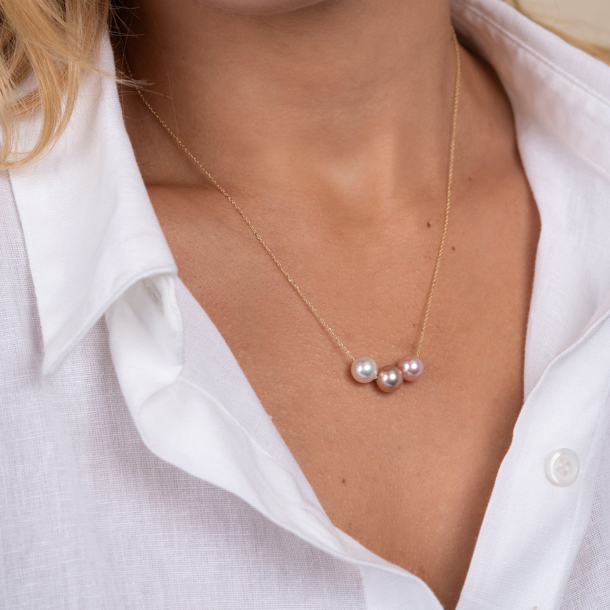 The diamonds we use are also very high grade. We use stones with VS1 clarity and color grade G. Each setting is complemented by a specially-selected pearl, chosen to complement the design of the pendant.