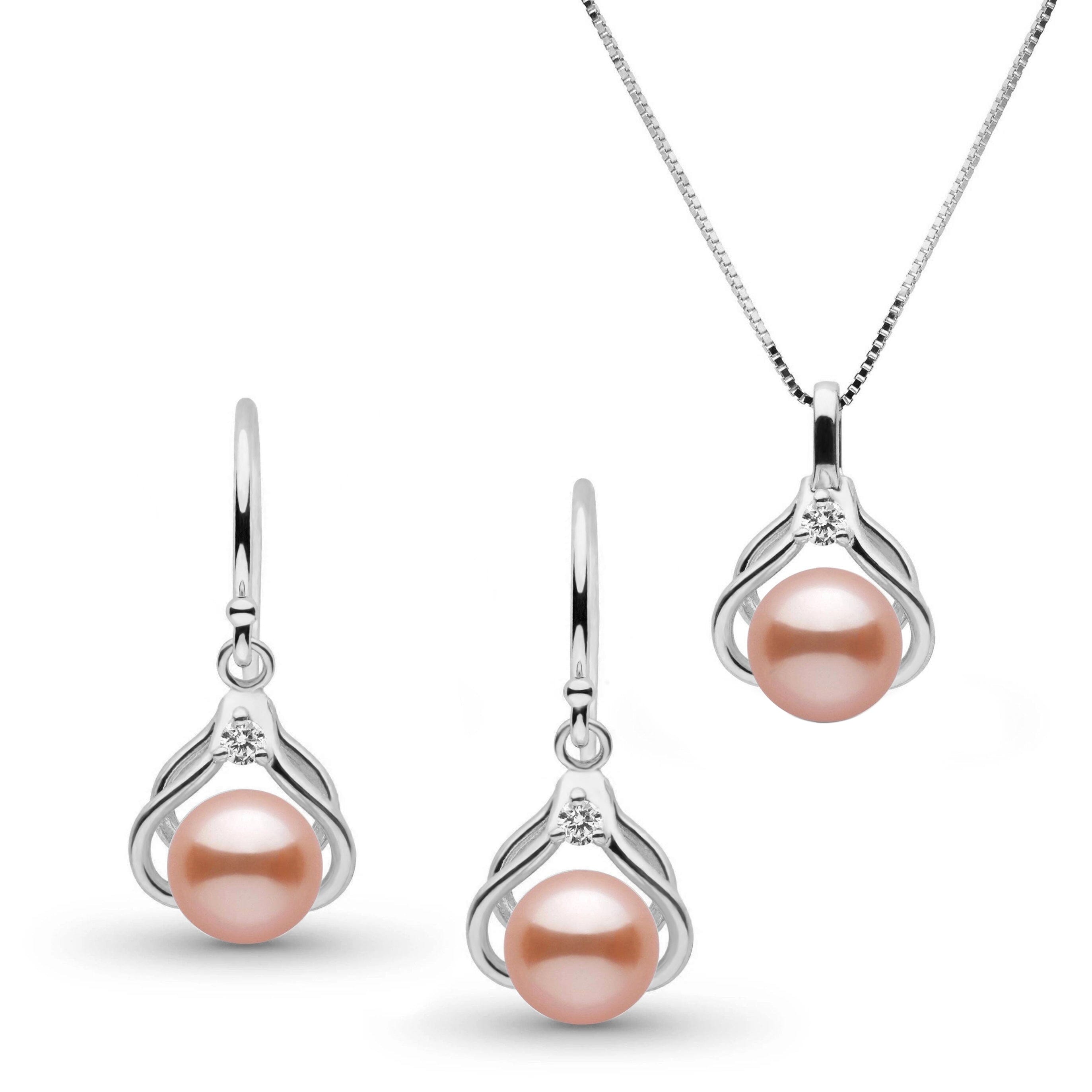 Our Tiara Collection pendant features a luminous 6.5–7.0 mm natural pink Freshadama pearl, crowned with a 0.03 cttw VS1-G diamond. It pairs perfectly with the matching earrings, each accented with 0.06 cttw of VS1-G diamonds—grades typically reserved for fine solitaire pieces. Together, the set combines the brilliance of high-quality diamonds with the rare beauty of Freshadama pearls.