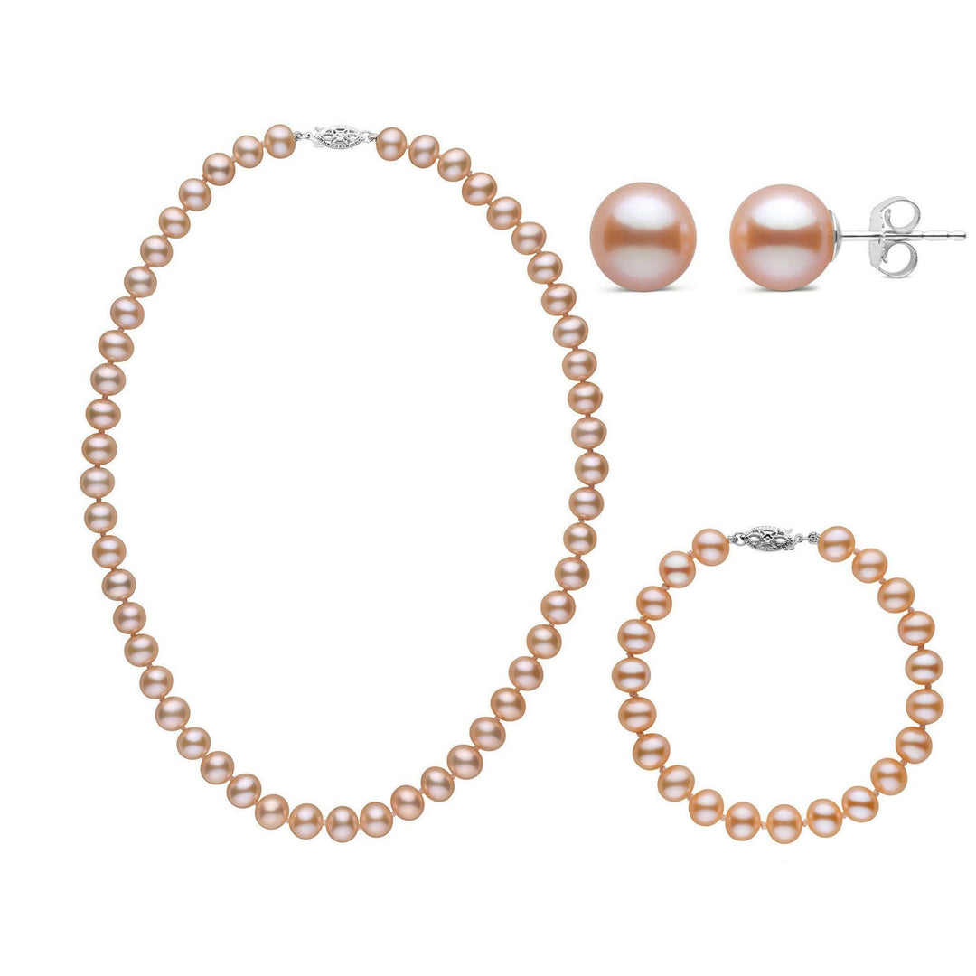 This refined three-piece set features a necklace, bracelet, and matching stud earrings made with 8.5–9.0 mm AAA quality freshwater pearls in their natural pink to peach hues. The soft, romantic color combined with a more substantial size gives this set an elegant and elevated presence—ideal for those who want pearls with both beauty and character.