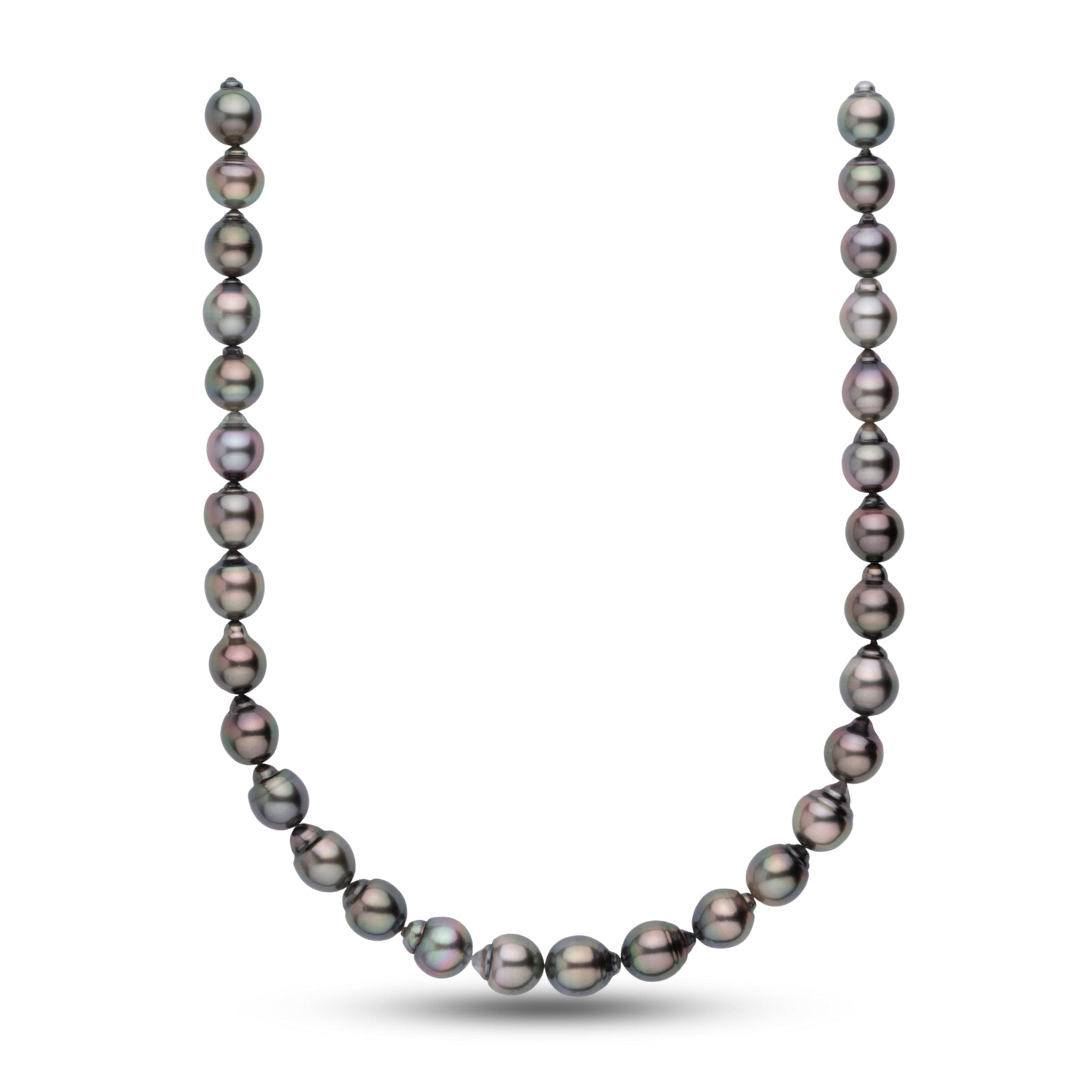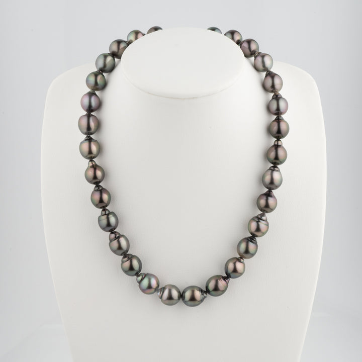 This stunning strand features drop to baroque Tahitian pearls measuring 11.1–11.9 mm. The pearls have a silver-green body color with a strong peacock overtone—rich blends of green, blue, and subtle purple that shimmer across the surface. Graded AAA, the pearls are smooth, highly lustrous, and well matched throughout.