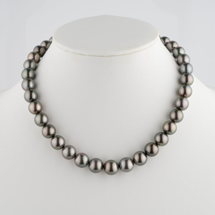 This one-of-a-kind necklace is composed of round, AAA quality Tahitian pearls measuring 10.0-12.5 mm in diameter and approximately 18 inches in length including the clasp.