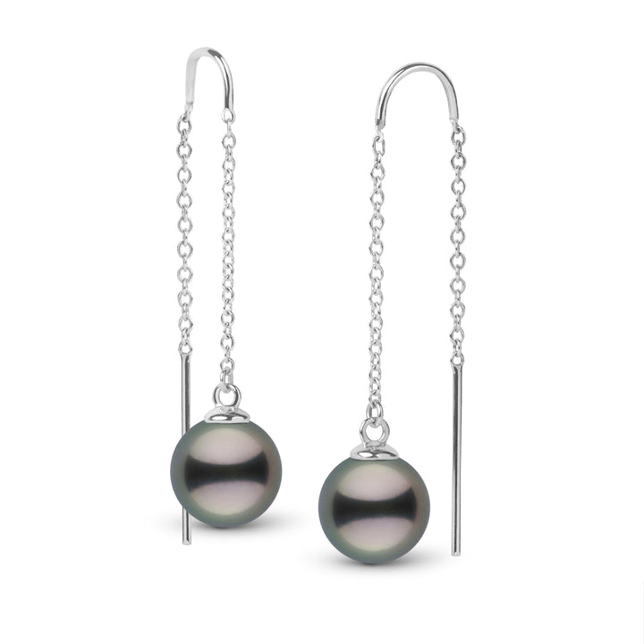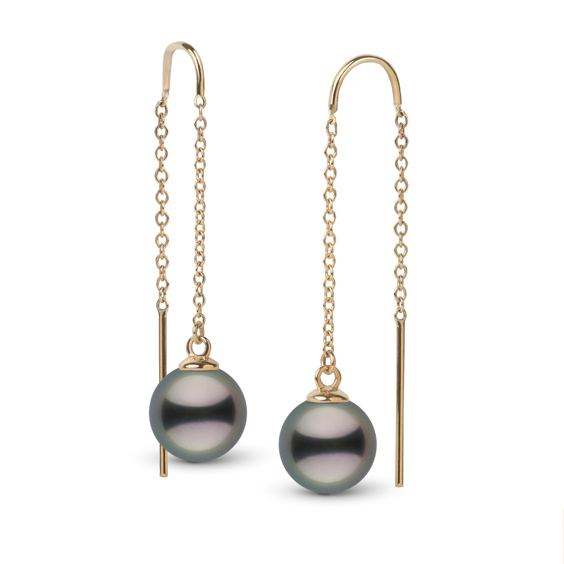 Elevate your style with these beautiful threader earrings. Crafted in 14 karat gold, the delicate chain hangs from a curved bar which will keep these threader earrings in place. Finished with 9.0-10.0 mm Tahitian round pearls, these earrings are a "fan favorite" item.