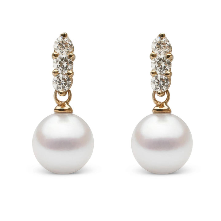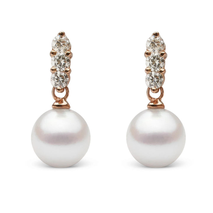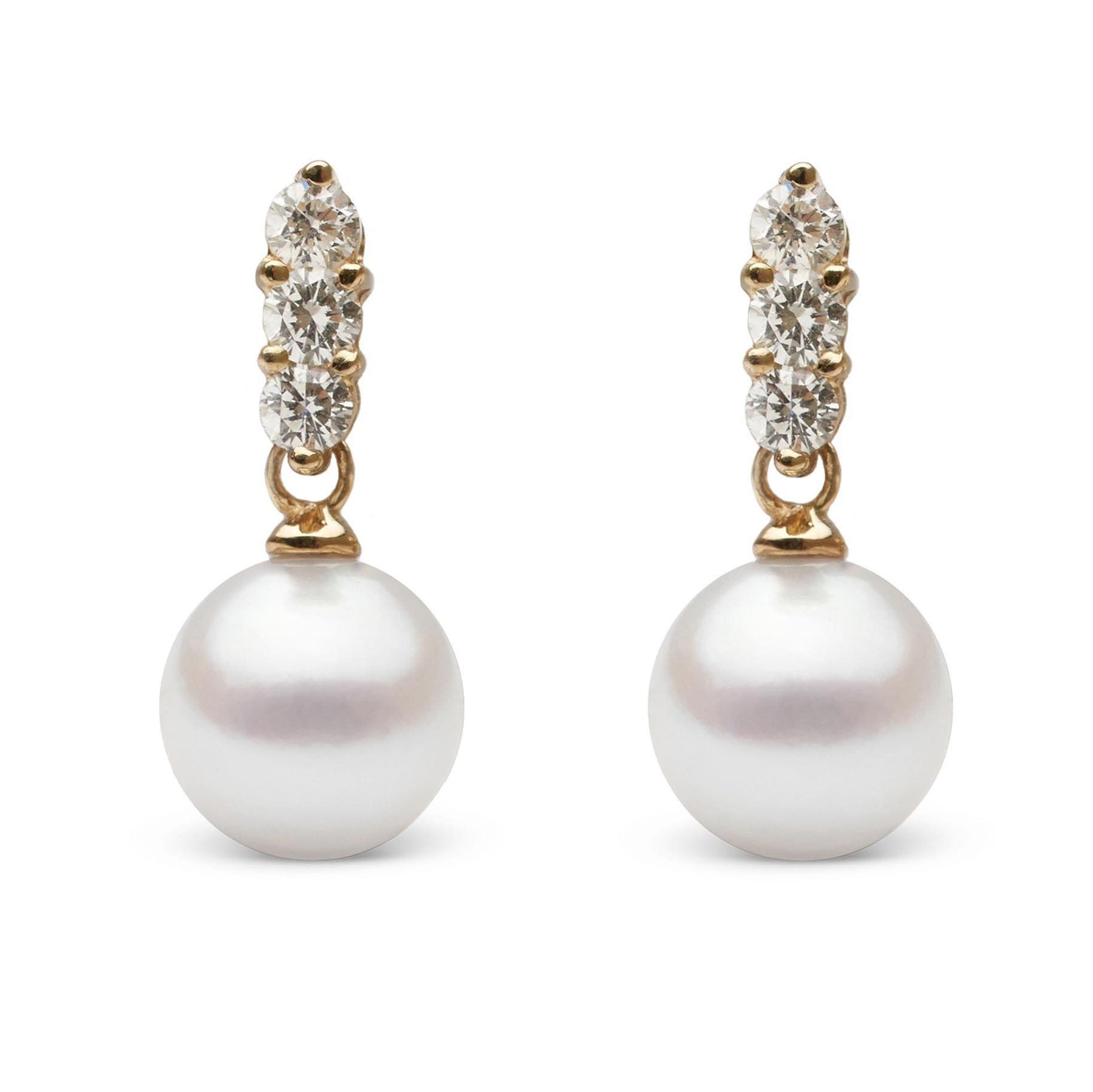 With three sparkling diamonds adorning each 8.0-8.5 mm Akoya pearl, our Trio Collection earrings will impress even the most discerning pearl connoisseur. The high quality G-VS1 diamonds have a total weight of 0.40 carats, and are masterfully set in your choice of 14 karat yellow, white or rose gold settings.