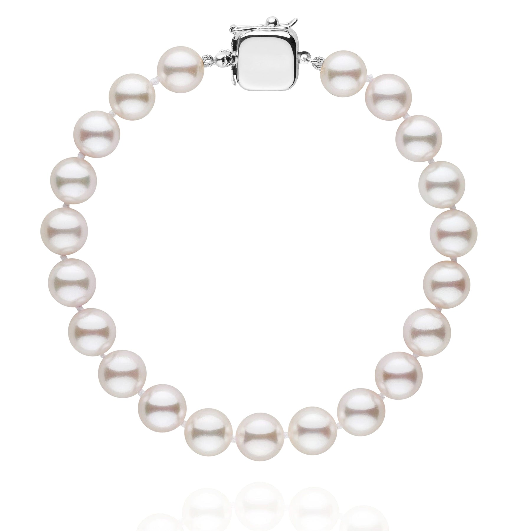 Perfectly round and highly lustrous 7.5-8.0 mm Japanese Akoya pearls are used to create this elegant bracelet. The pearls are individually knotted on silk thread and the strand is finished with a solid, 14-karat gold clasp ready for engraving. The clasp comes with an added safety catch so you will never lose your pearls.