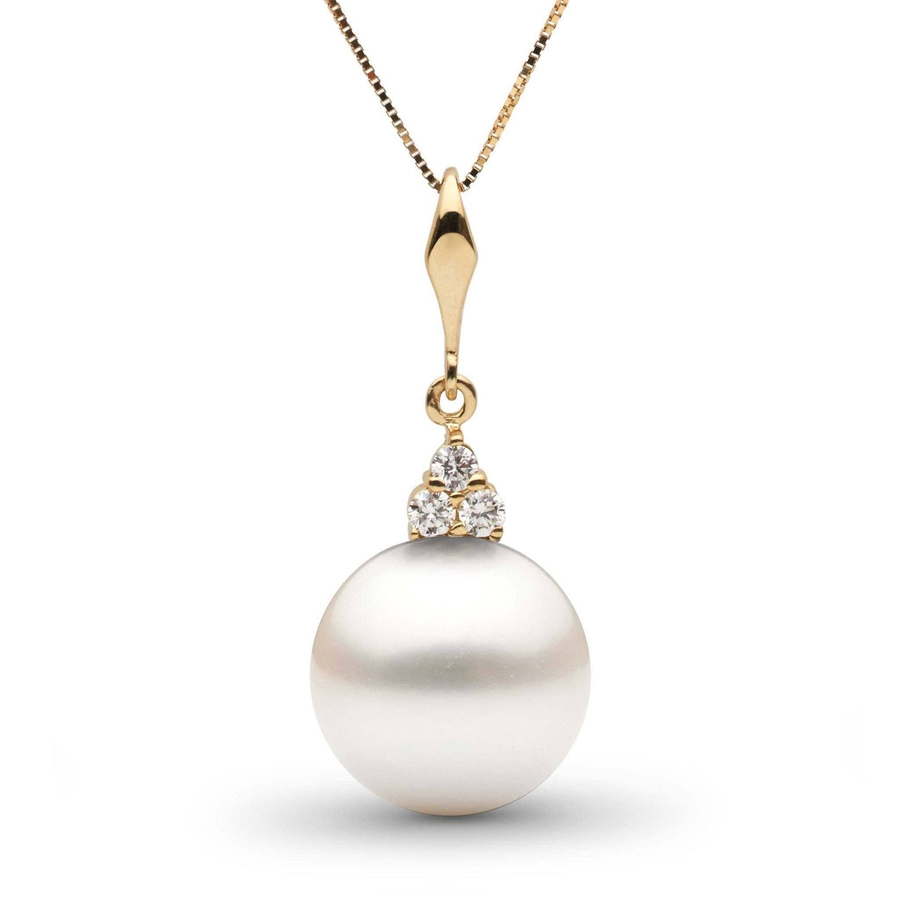 This pendant showcases the extraordinary beauty of a 12.0–13.0 mm White South Sea pearl, one of the rarest sizes produced in the world. Perfectly round with luminous luster and a smooth, radiant surface, the pearl is set beneath three round brilliant-cut VS1–G diamonds totaling 0.15 cttw. The simple 14k gold setting highlights the pearl’s impressive presence while adding a touch of refined sparkle.