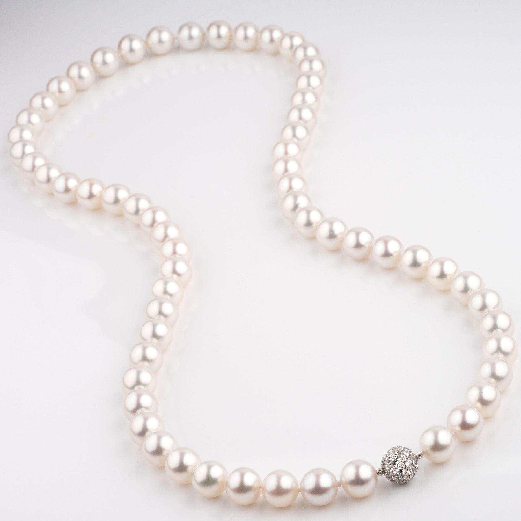 Individually photographed, this is the exact necklace you will receive. The 33.5-inch strand is completed with a platinum and 18k white gold clasp set with 40 brilliant diamonds totaling 2.95 carats, a sophisticated complement to pearls of this caliber.