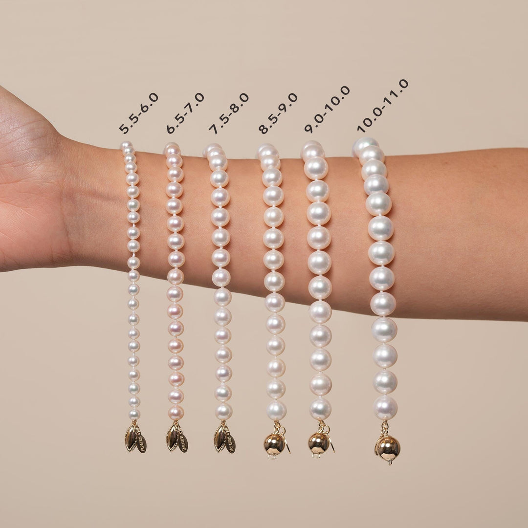 The pearls are individually hand-knotted on silk thread so that no two pearls ever rub against each other, and if the bracelet ever snaps, you won't lose a single pearl. The clasp is composed of solid 14 karat gold with a safety catch mechanism, ensuring your pearls always stay safe and secure.