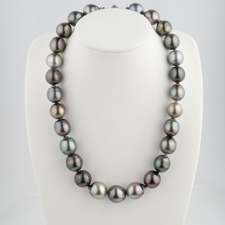 This extraordinary strand features plump, smooth drop-shaped Tahitian pearls ranging from 14.0 to 16.0 mm—exceptionally large for a multicolor strand of this quality. The body colors span a vivid range of greens, pistachio, chocolate, blue, and peacock. Each pearl displays striking saturation and a mirror-like luster that’s rare to find in pearls of this size.