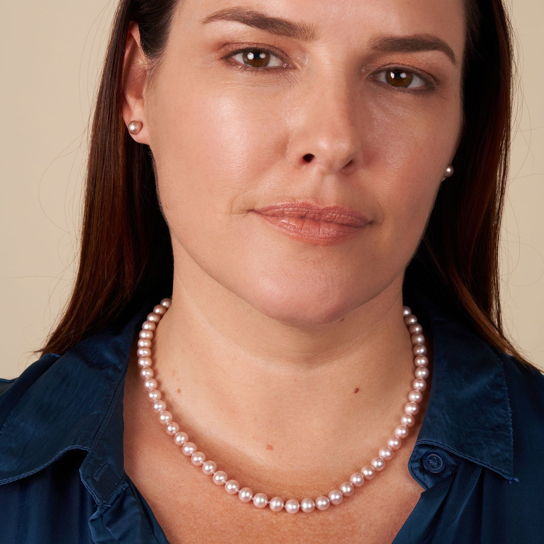 AAA freshwater pearls represent the top tier of traditional freshwater pearl grading, offering exceptional luster and surface quality. The matching stud earrings complete the set with refined balance and ease.