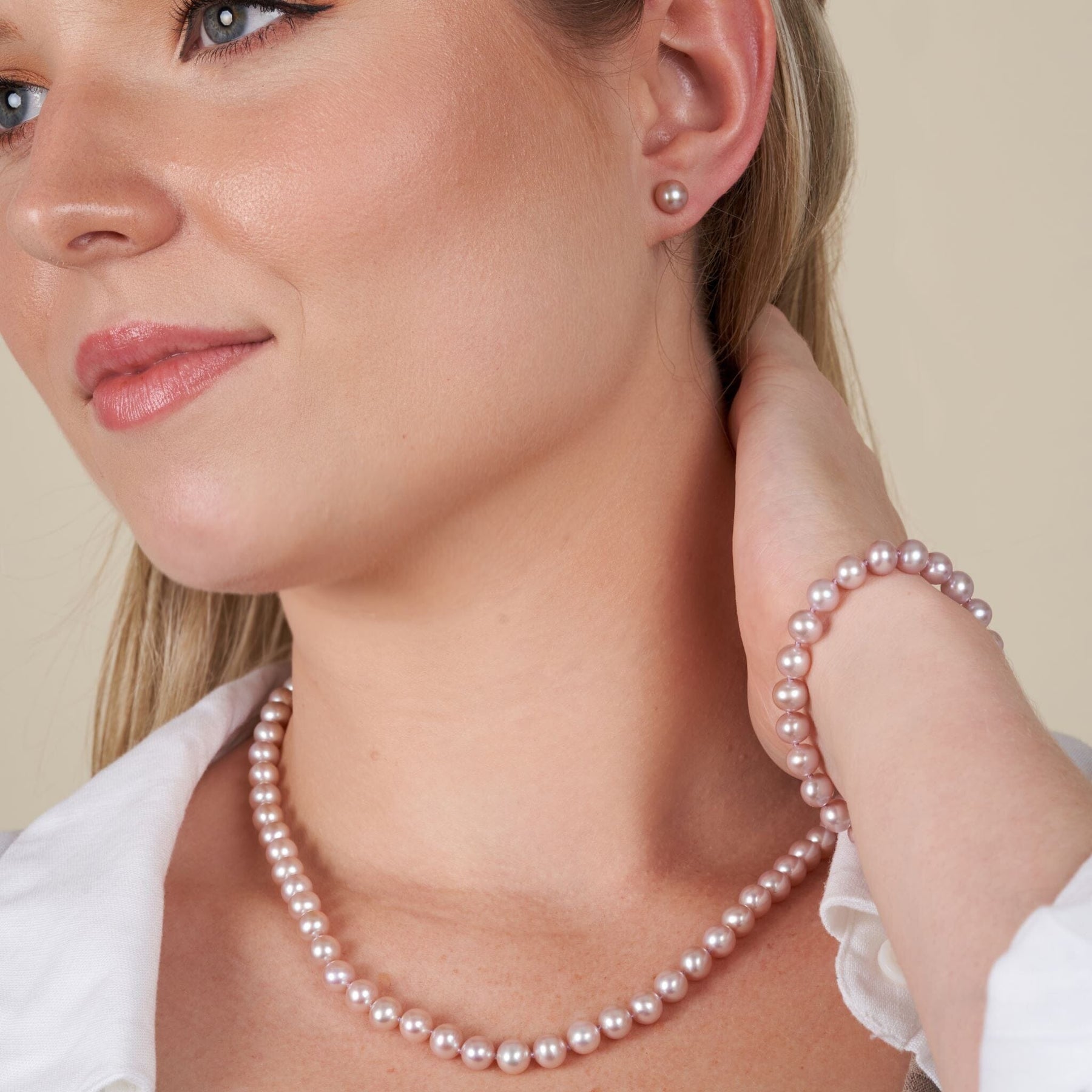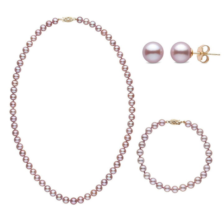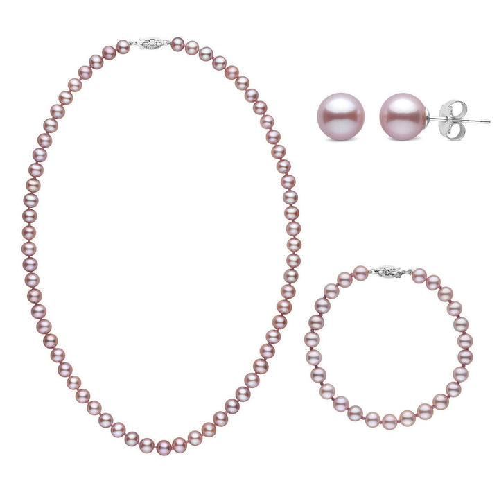 This classic three-piece set features a necklace, bracelet, and matching stud earrings—each crafted with 6.5–7.0 mm AAA quality natural-color lavender freshwater pearls that are nearly perfectly round and beautifully matched for luster, tone, and symmetry. With their soft violet glow and near-round shapes, these pearls offer a distinctive take on timeless sophistication and everyday elegance.