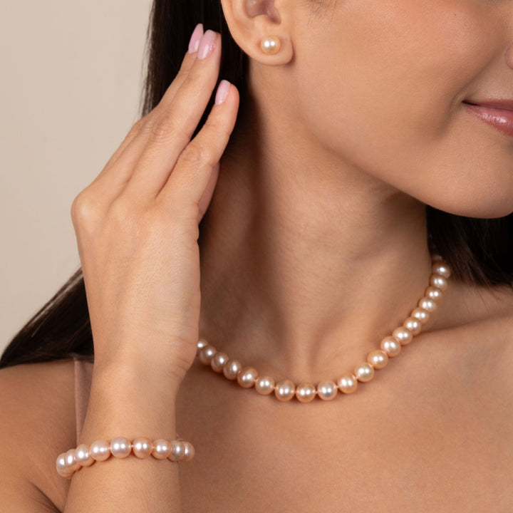 This warm and elegant three-piece set features a necklace, bracelet, and matching stud earrings, crafted with 8.5–9.0 mm AA+ quality freshwater pearls in their natural pink to peach tones. The larger pearl size offers a more substantial, sophisticated look while the soft, sun-kissed hues add a romantic and feminine touch.