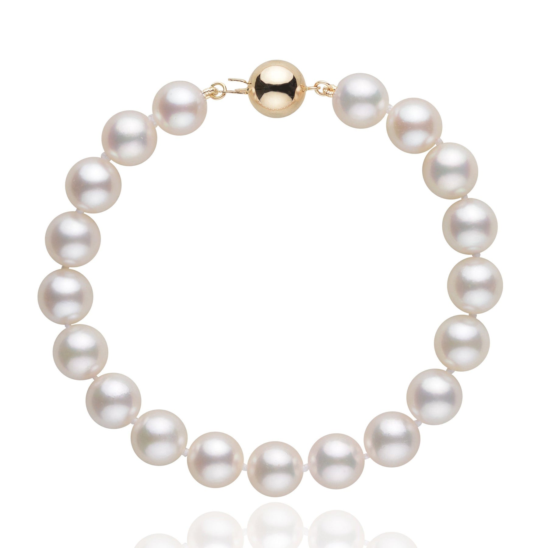 This elegant yet simple bracelet is composed of perfectly round Japanese akoya pearls. The pearls measure 8.5-9.0 mm, which is on the larger size for akoya, but easily wearable. The pearls are individually knotted on twin silk so they never rub or scratch, and the bracelet is finished with a solid gold clasp with a safety catch. Your pearls will always be secure.