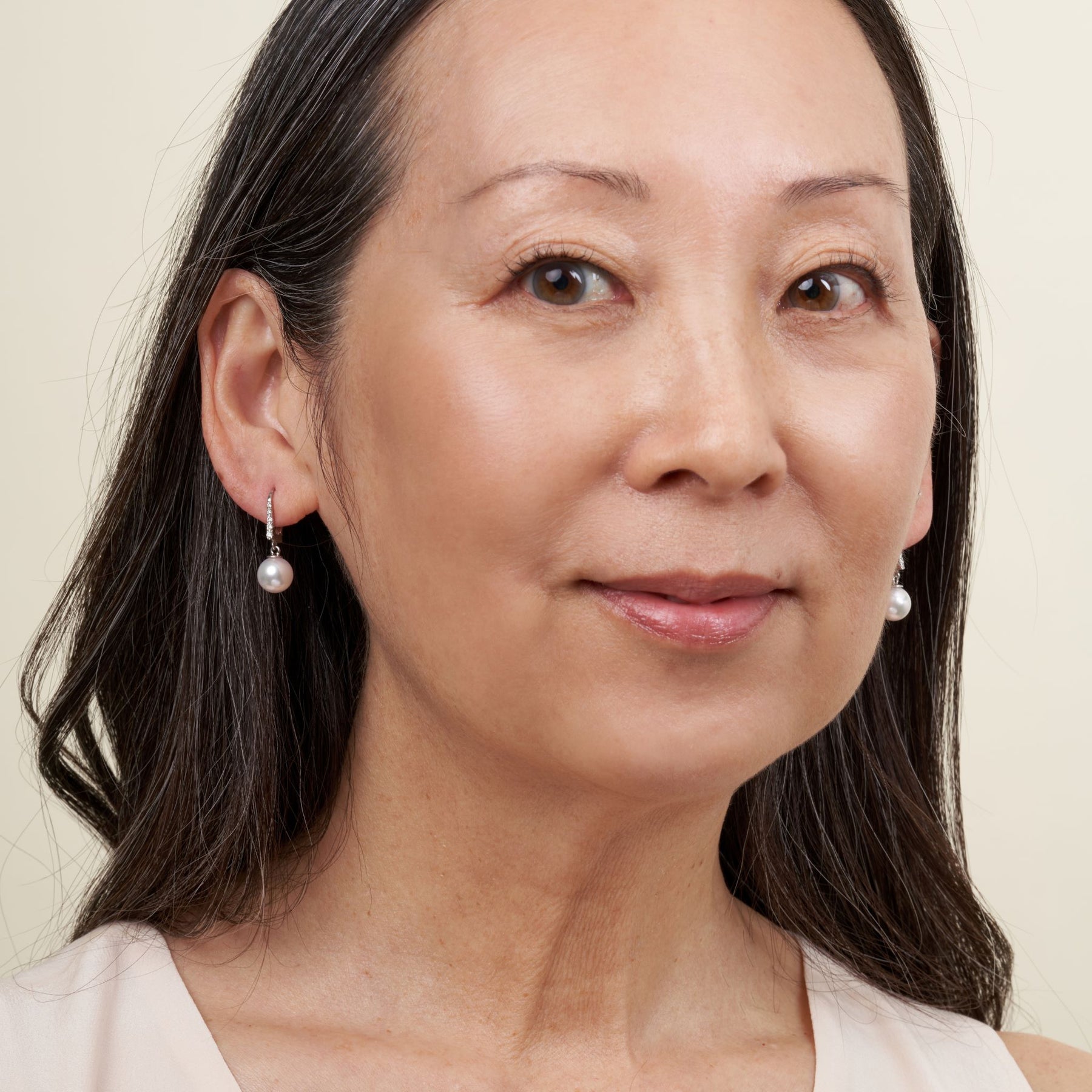 Allure Collection Akoya 8.0-8.5 mm Pearl & Diamond Dangle Earrings on Model in white gold