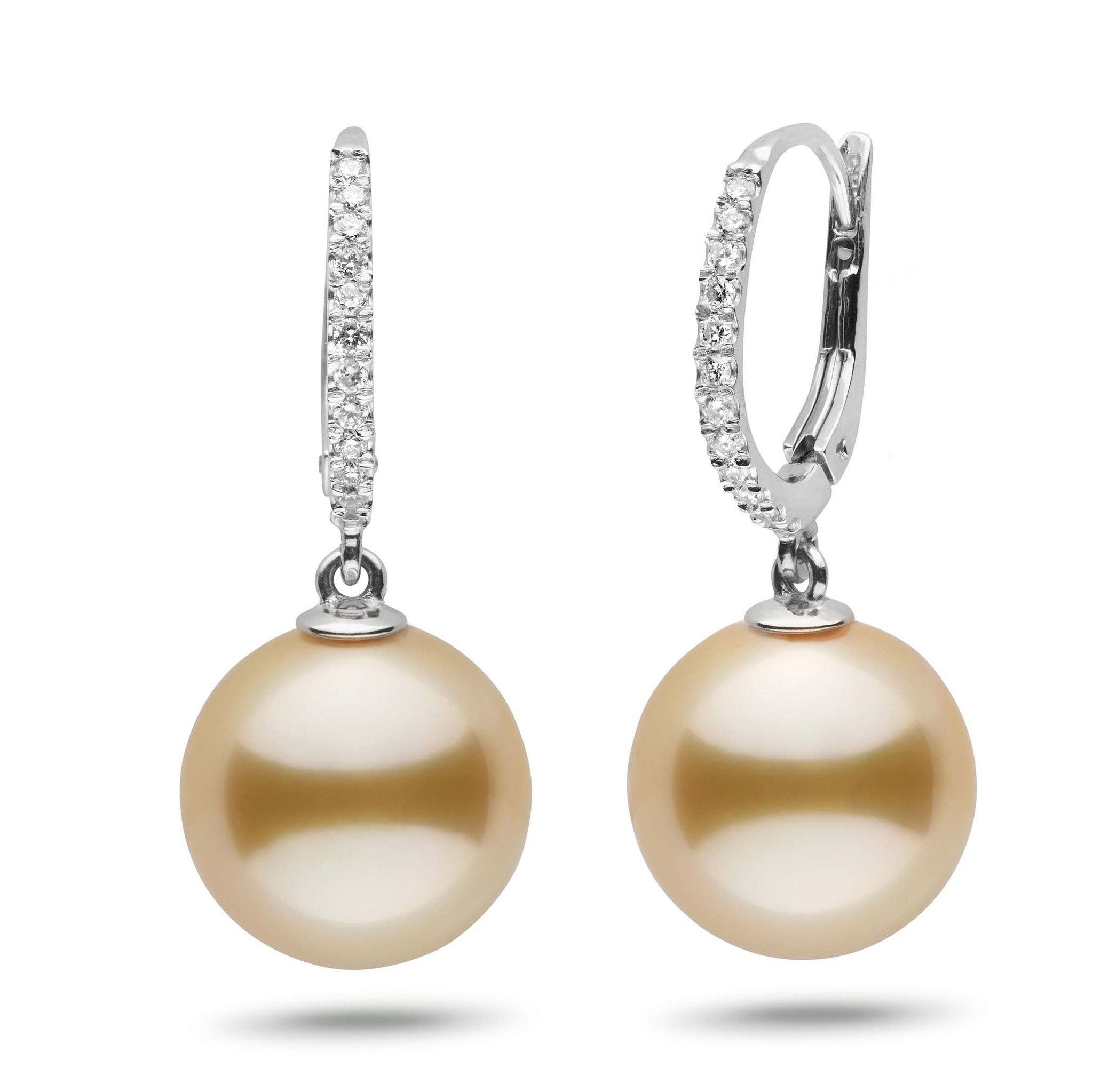 This popular earring design features AAA-quality, round golden South Sea pearls measuring 12.0-13.0 mm, dangling below a hoop-style setting with 11 sparkling diamonds on each ear. There are 22 diamonds with a total carat weight of 0.22 cttw.