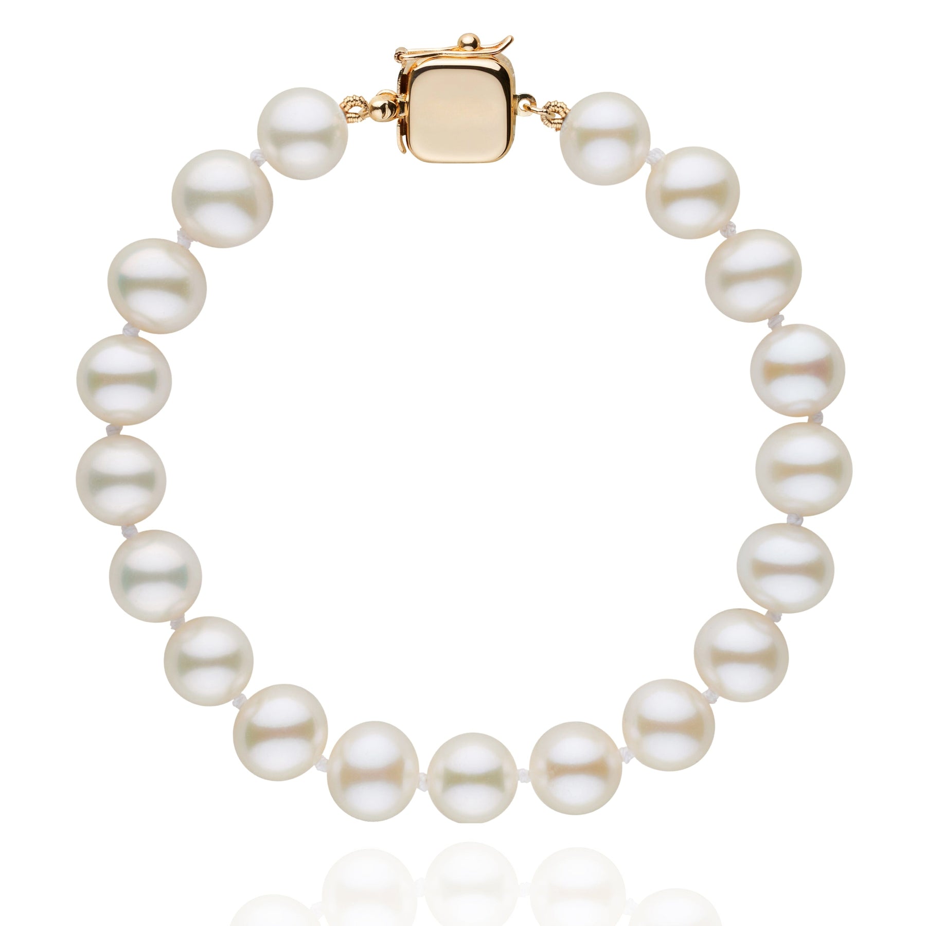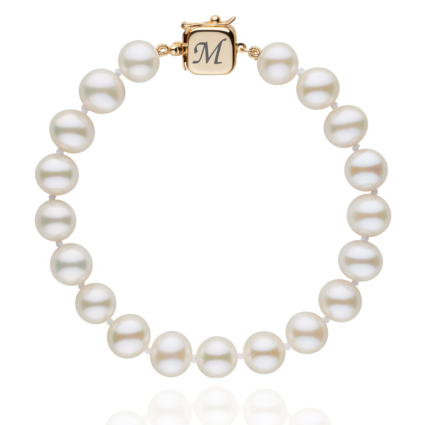 Beautifully round and highly lustrous 8.5-9.0 mm Freshwater pearls are used to create this elegant bracelet. The pearls are individually knotted on silk thread and the strand is finished with a solid, 14-karat gold clasp ready for engraving. The clasp comes with an added safety catch so you will never lose your pearls.